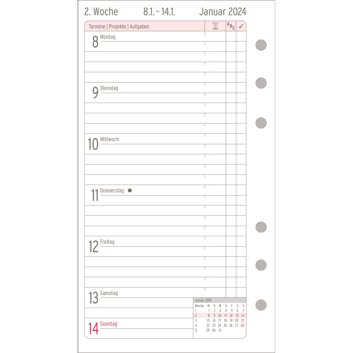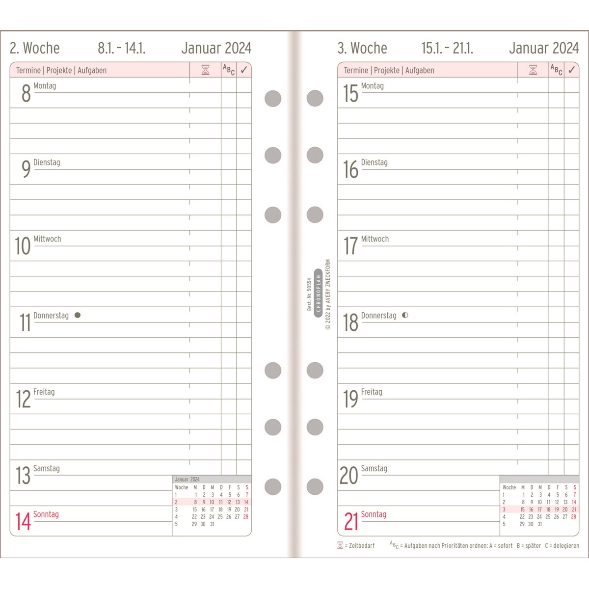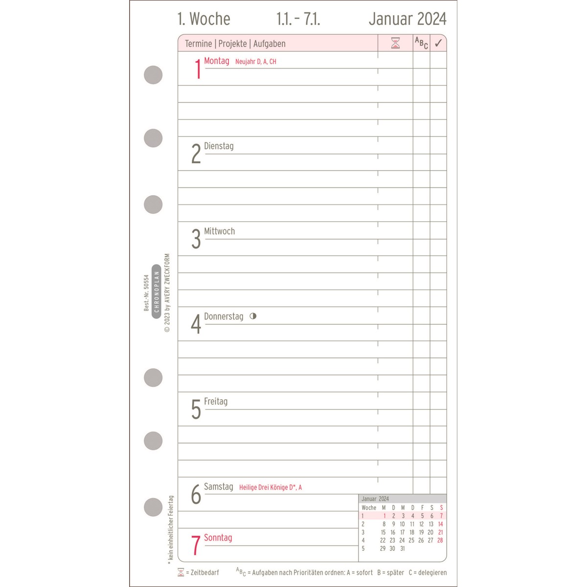 Mit dem Chronoplan Wochenplan 2024 im Midi Format (96 x 172 mm) für Ihren Terminplaner behalten Sie die Übersicht über Ihre Termine und Aufgaben. Diese Kalendereinlage ermöglicht ein effizientes und übersichtliches Zeitmanagement mit einer Seite pro Woche. Die Tage sind untereinander in Zeilen angeordnet. Durch den Zweifarbdruck wird die Wochenplanung übersichtlicher. Zudem ermöglicht Ihnen der Chronoplan Wochenplan das Notieren von Wochenzielen, Priorisierung von Aufgaben und eine variable Zeiteinteilung bis 22 Uhr. Viele weitere Extras wie Jahresplan, Ferien- und Feiertagsübersicht, Postleitzahlenkarte u.v.m. machen den Chronoplan Terminplaner komplett. Dieser Wochenkalender passt dank Universallochung in alle gängigen Terminplaner wie z.B. Chronoplan, Time system, Filofax und viele mehr.
