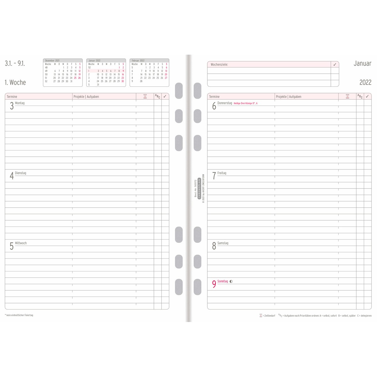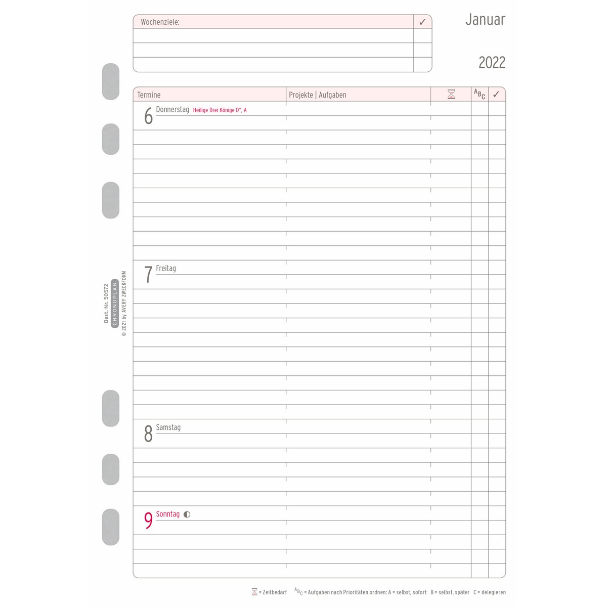 Mit dem ausklappbaren CHRONOPLAN Jahresplan 2023 im Midi Format (96x172 mm) für Ihren Terminplaner behalten Sie einen schnellen und praktischen Überblick über Ihre monatlichen Termine und Aufgaben. Diese Kalendereinlage hat eine Leporello Falzung und 2-Lochleisten für ein komfortables Planen rechts von der Mechanik. Der Kalender besteht aus einer extra starken Papierqualität von 120g/m, um ein Ausreißen zu verhindern. Zudem haben Sie mit diesem Chronoplan Jahresplaner auch die Möglichkeit Ihre beruflichen und privaten Monatsziele zu planen und zu priorisieren, der Zweifarbdruck sorgt hierbei für eine gute Übersicht. Dieser Wochenkalender passt dank Universallochung in alle gängigen Terminplaner wie z.B. Chronoplan, Time system, Filofax und viele mehr. CHRONOPLAN Zeitmanagement by Avery Zweckform.