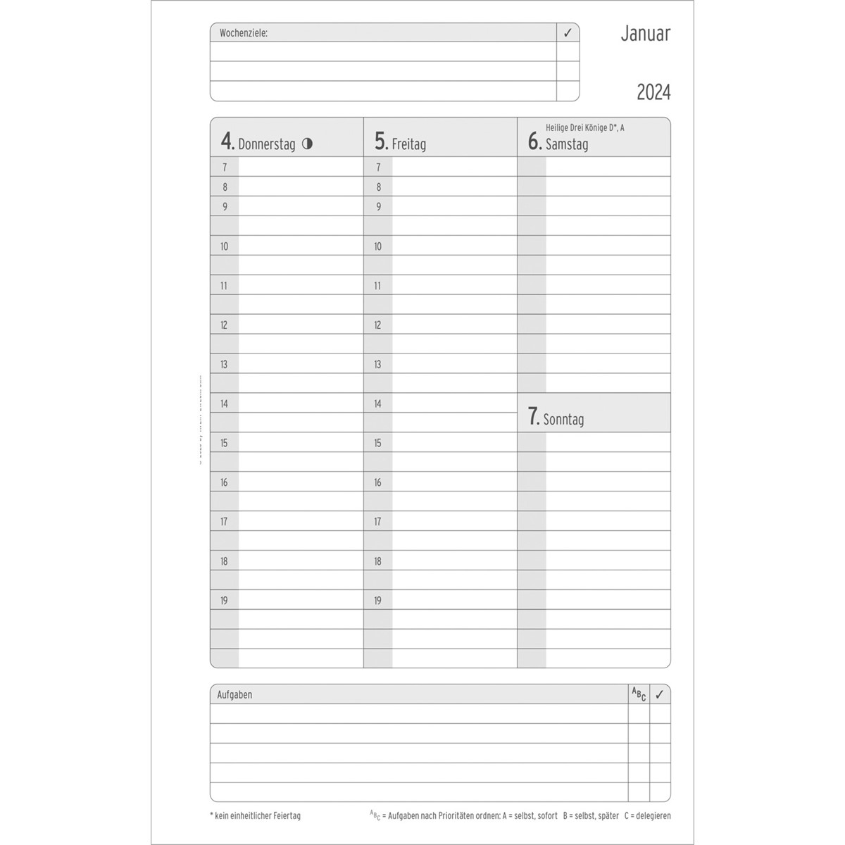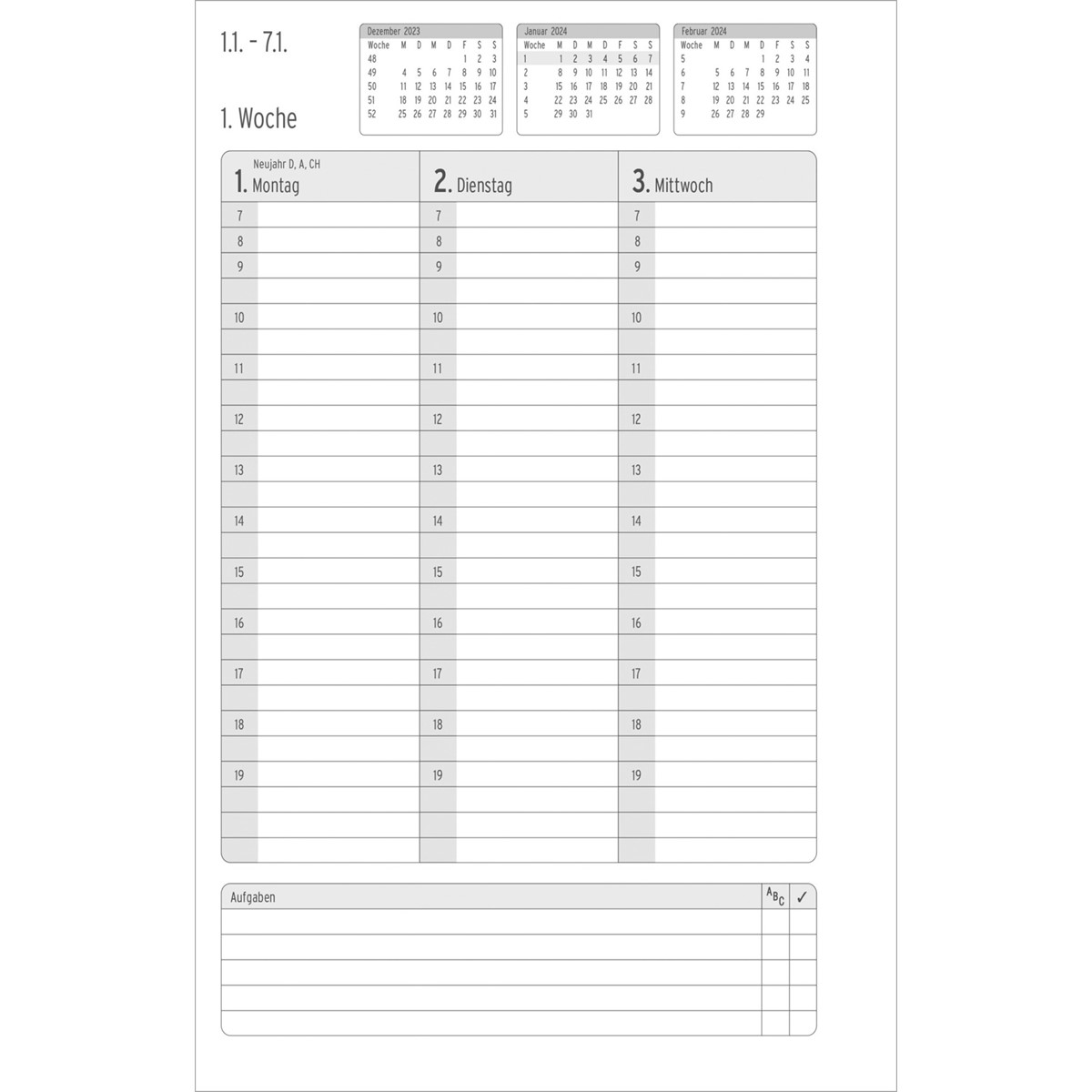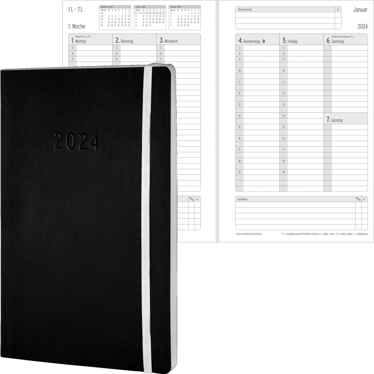 Der CHRONOPLAN Buchkalender mit Wochenplan für das Jahr 2024 ist der optimale Terminplaner für ein effizientes Zeitmanagement. Der Black&White Edition Kalender im A5 Format bietet eine übersichtliche Wochenplanung auf zwei Seiten pro Woche. Er beinhaltet praktische Zeitmanagement Elemente wie z.B. Definition von Wochenzielen, Einstufung in Prioritäten und Aufteilung in Termine und Aufgaben. Der schwarze Softcover Einband in Leinenprägung besticht durch die smarte Optik in dezenten Farben. Das cremefarbene Kalender Papier mit FSC® Zertifizierung sorgt dabei für einen besonders edlen Look. Der praktische Gummiverschluss mit flexibler Stiftschlaufe, ein cremefarbenes Einmerkband und viele weitere Extras wie Jahresplan, Ferien- und Feiertagsübersicht sowie Notizblätter machen den Chronoplan Terminplaner komplett.