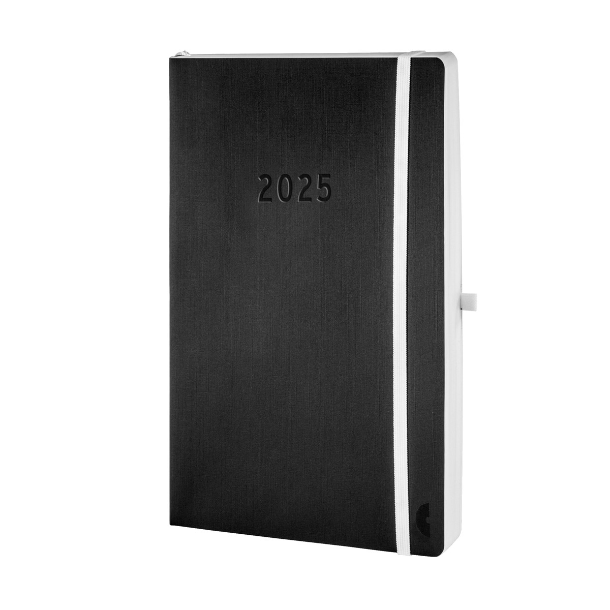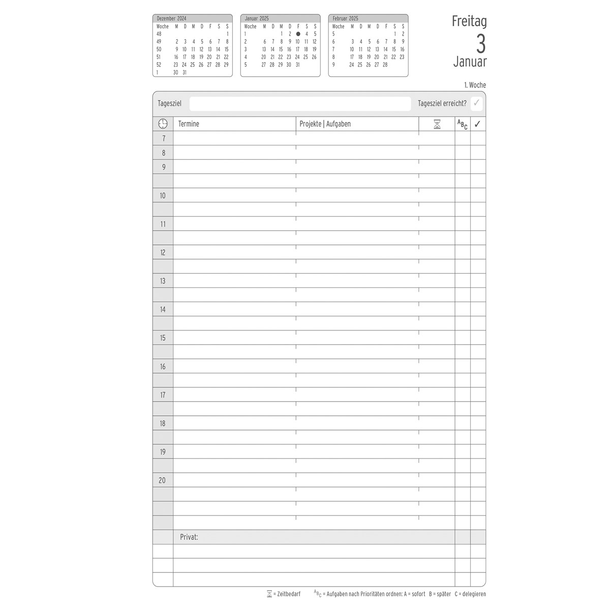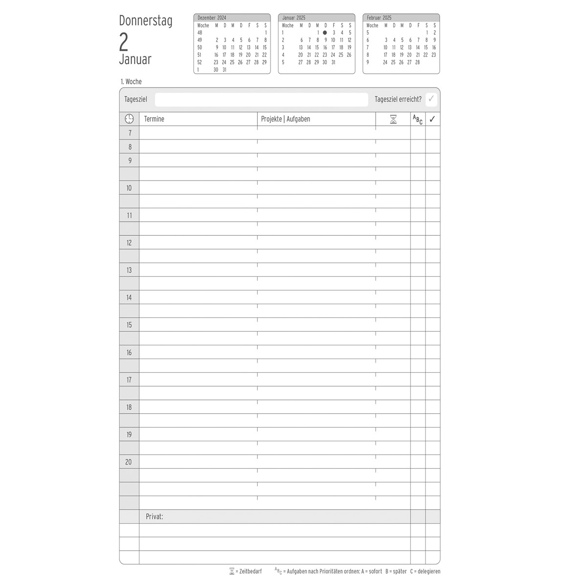Der CHRONOPLAN Buchkalender mit Tagesplan für das Jahr 2025 ist der optimale Terminplaner für ein effizientes Zeitmanagement. Der Black&White Edition Kalender im A5 Format bietet eine übersichtliche Tagesplanung auf einer Seite pro Tag. Er beinhaltet praktische Zeitmanagement Elemente wie z.B. Definition von Wochenzielen, Einstufung in Prioritäten und Aufteilung in Termine und Aufgaben. Der Buchkalender mit schwarzem Softcover Einband in Leinenprägung besticht durch die smarte Optik in dezenten Farben. Das cremefarbene Kalender Papier mit FSC® Zertifizierung sorgt dabei für einen besonders edlen Look. Der praktische Gummiverschluss mit flexibler Stiftschlaufe, ein cremefarbenes Einmerkband und viele weitere Extras wie Jahresplan, Ferien- und Feiertagsübersicht sowie Notizblätter machen den Chronoplan Terminplaner komplett.