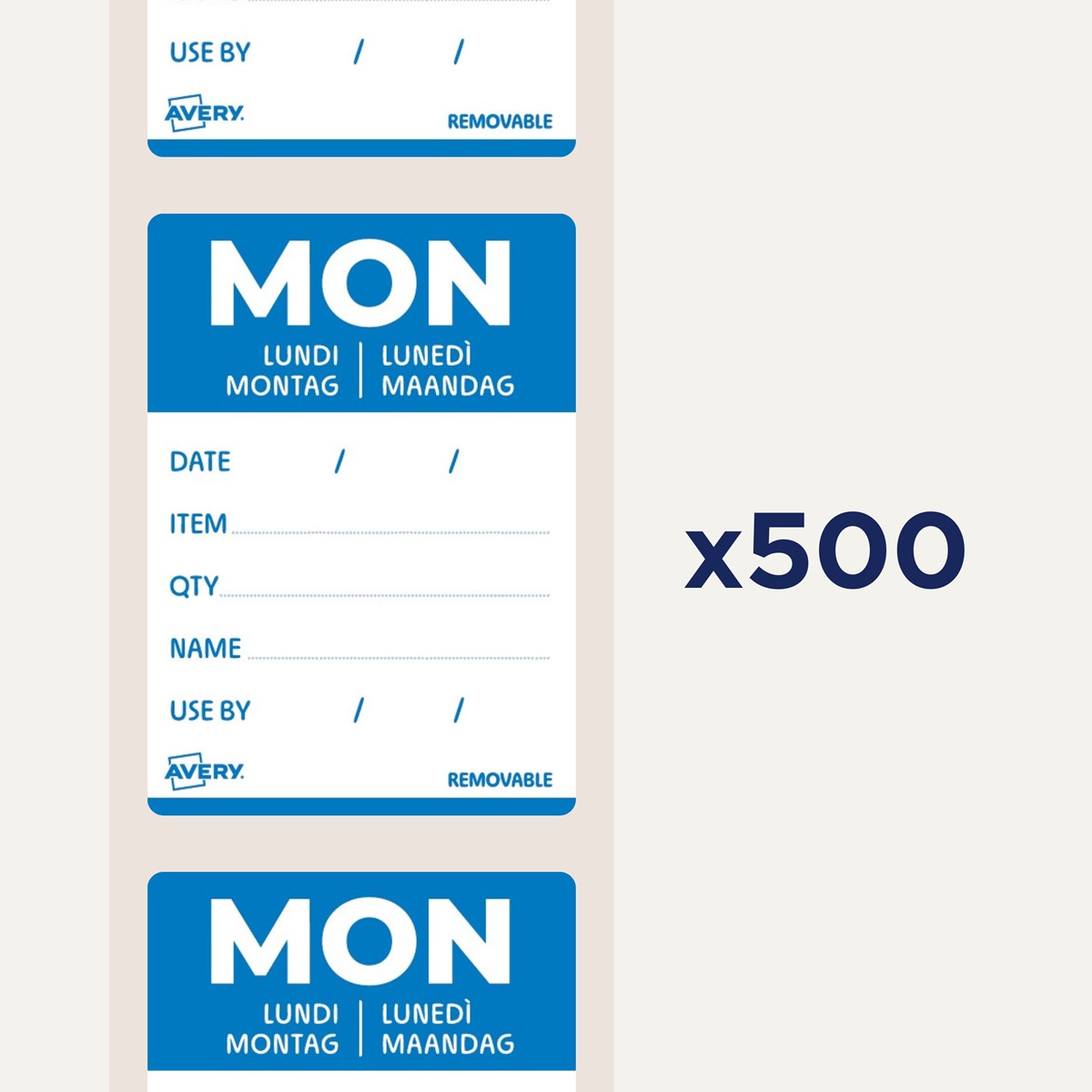 Qualität vom Etiketten-Experten: die ablösbaren, weißen Tages-Etiketten DLDFRIREV-500 von Avery Zweckform mit blauem Aufdruck "Monday" im Format 40 x 56 mm zum einfachen Beschriften mit beliebigem Stift sind ideal für eine effiziente, klare und HACCP-konforme Beschriftung in Gastronomie und Lebensmittelproduktion. 500 rückstandslos ablösbare Papier-Etiketten auf Rolle in einer praktischen Spenderbox zum einfachen Entnehmen.