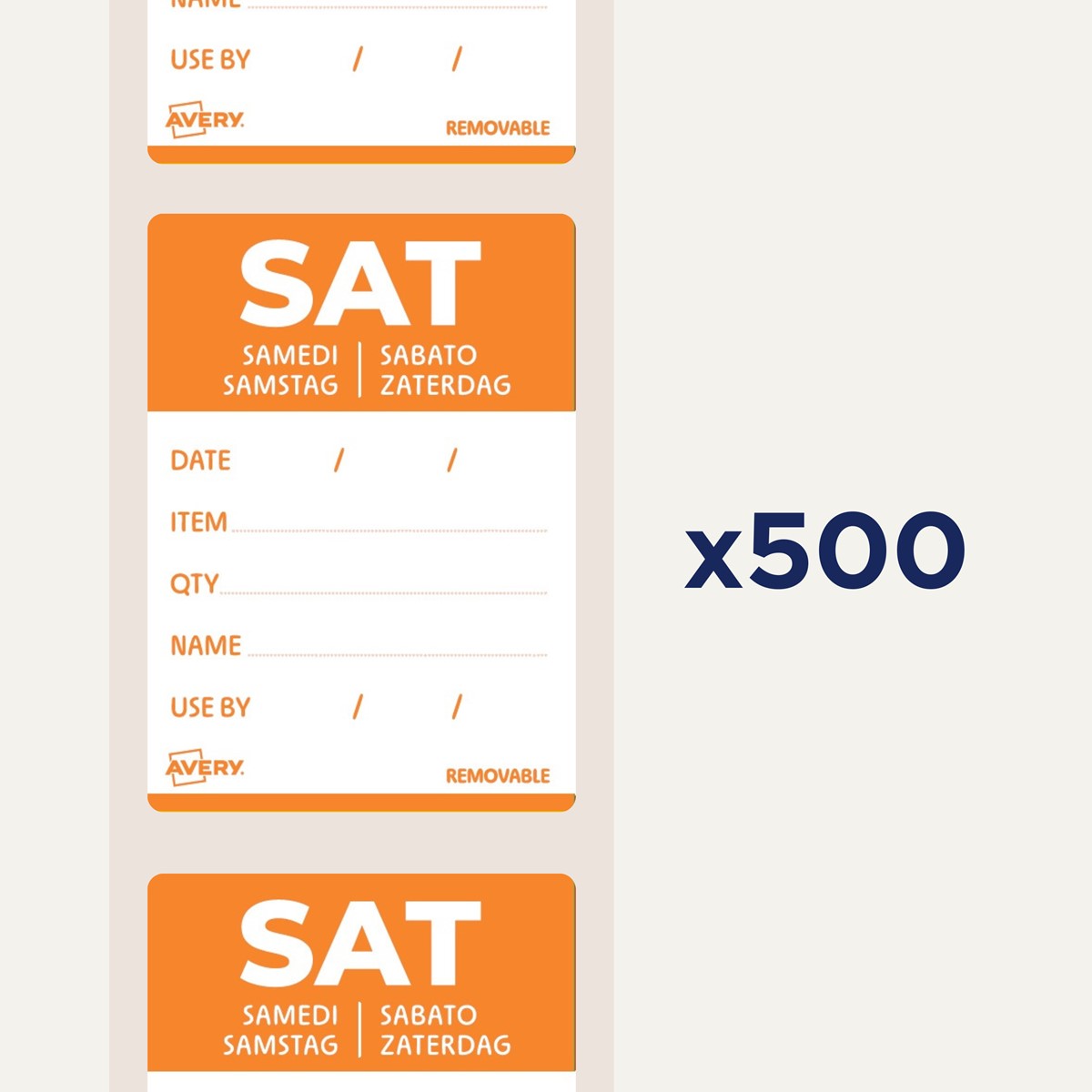 Qualität vom Etiketten-Experten: die ablösbaren, weißen Tages-Etiketten DLDFRIREV-500 von Avery Zweckform mit orangem Aufdruck Saturday im Format 40 x 56 mm zum einfachen Beschriften mit beliebigem Stift sind ideal für eine effiziente, klare und HACCP-konforme Beschriftung in Gastronomie und Lebensmittelproduktion. 500 rückstandslos ablösbare Papier-Etiketten auf Rolle in einer praktischen Spenderbox zum einfachen Entnehmen.