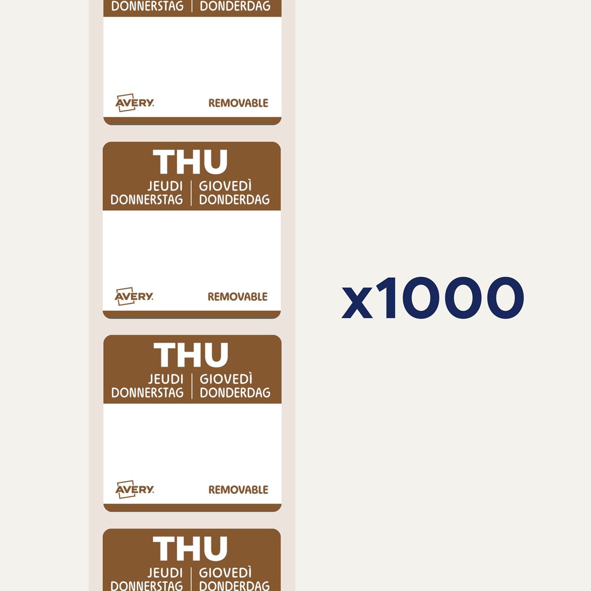 Qualität vom Etiketten-Experten: die ablösbaren, weißen Tages-Etiketten DLSTHUREV-1000 von Avery Zweckform mit braunem Aufdruck Thursday im Format 25 x 25 mm zum einfachen Beschriften mit beliebigem Stift sind ideal für eine effiziente, klare und HACCP-konforme Beschriftung in Gastronomie und Lebensmittelproduktion. 1.000 rückstandslos ablösbare Papier-Etiketten auf Rolle in einer praktischen Spenderbox zum einfachen Entnehmen.