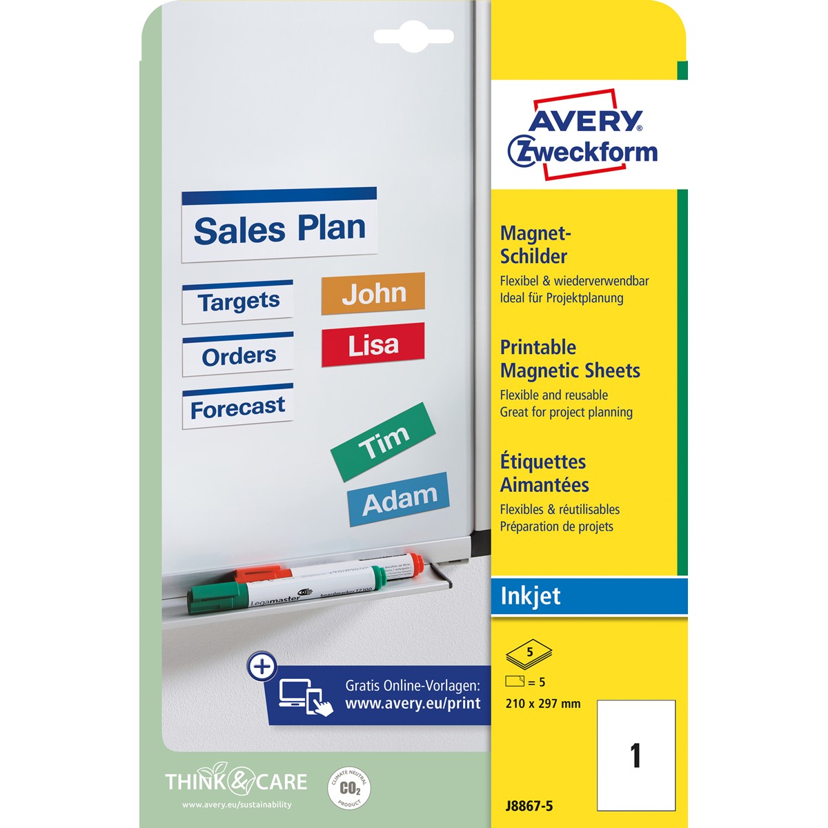 Die weißen Magnet Schilder J8867-5 für Inkjetdrucker im Format 210x297 mm von AVERY ZWECKFORM lassen sich einfach wiederverwenden, neu positionieren und sind somit flexibel einsetzbar (5 Magnet Schilder pro Packung). Drucken Sie Ihre Ideen, Arbeitsschritte oder die Namen Ihrer Team-Mitglieder auf die Magnetschilder und heften Sie diese an Ihr Flipchart. Sie können diese Magnete einfach selbst gestalten und sind somit ideal für die Verwendung auf White Boards, Lagerregalen aus Metall oder Magnettafeln. Gestalten und bedrucken Sie Ihre Magnete schnell und einfach - mit den kostenlosen Avery Zweckform Etiketten Vorlagen und Software-Lösungen unter www.avery-zweckform.eu/print. Achtung: Die Magnetschilder weisen ein hohes Gewicht auf. Bitte stellen Sie vor dem Bedrucken sicher, dass Ihr Inkjet-Drucker dickes und schweres Material verarbeiten kann. Informationen hierzu finden Sie in Ihrem Drucker- Handbuch.