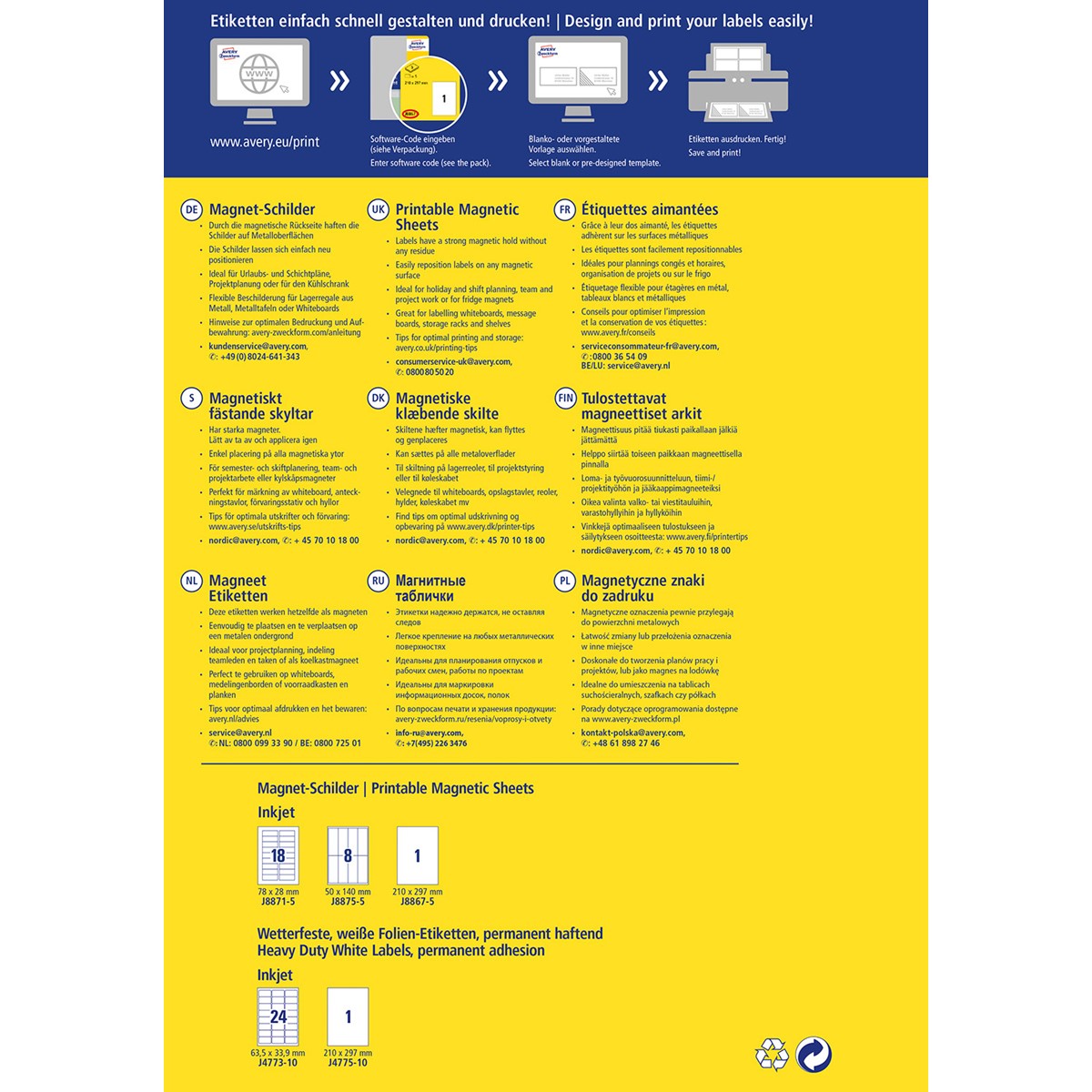 Die weißen, mikroperforierten Magnet Schilder J8875-5 für Inkjetdrucker im Format 50x140 mm von AVERY ZWECKFORM lassen sich einfach wiederverwenden, neu positionieren und sind somit flexibel einsetzbar (40 Magnet Schilder pro Packung). Drucken Sie Ihre Ideen, Arbeitsschritte oder die Namen Ihrer Team-Mitglieder auf die Magnetschilder und heften Sie diese an Ihr Flipchart. Sie können diese Magnete einfach selbst gestalten und sind somit ideal für die Verwendung auf White Boards, Lagerregalen aus Metall oder Magnettafeln. Gestalten und bedrucken Sie Ihre Magnete schnell und einfach - mit den kostenlosen Avery Zweckform Etiketten Vorlagen und Software-Lösungen unter www.avery-zweckform.eu/print. Achtung: Die Magnetschilder weisen ein hohes Gewicht auf. Bitte stellen Sie vor dem Bedrucken sicher, dass Ihr Inkjet-Drucker dickes und schweres Material verarbeiten kann. Informationen hierzu finden Sie in Ihrem Drucker- Handbuch.