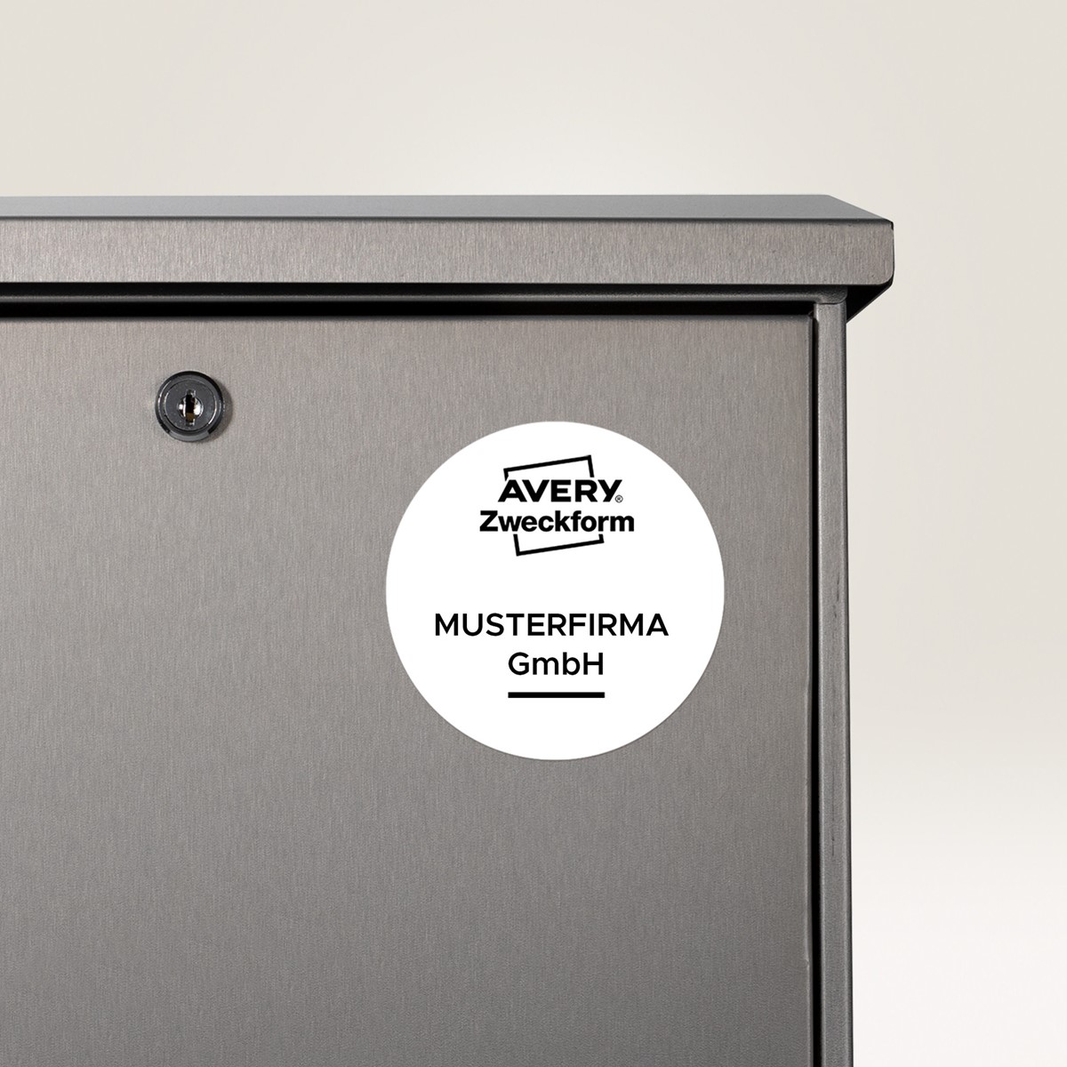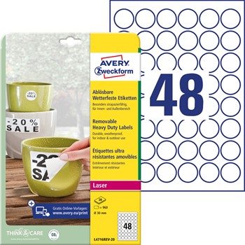 Qualität vom Etiketten-Experten: die ablösbaren, wetterfesten Etiketten L4716REV-20 im runden Format Ø 30 mm für Laser-Drucker von Avery Zweckform zeichnen sich durch eine extreme Strapazierfähigkeit im Innen- und Außenbereich aus. 960 matt beschichtete Folien-Etiketten aus Polyester auf 20 Bogen.