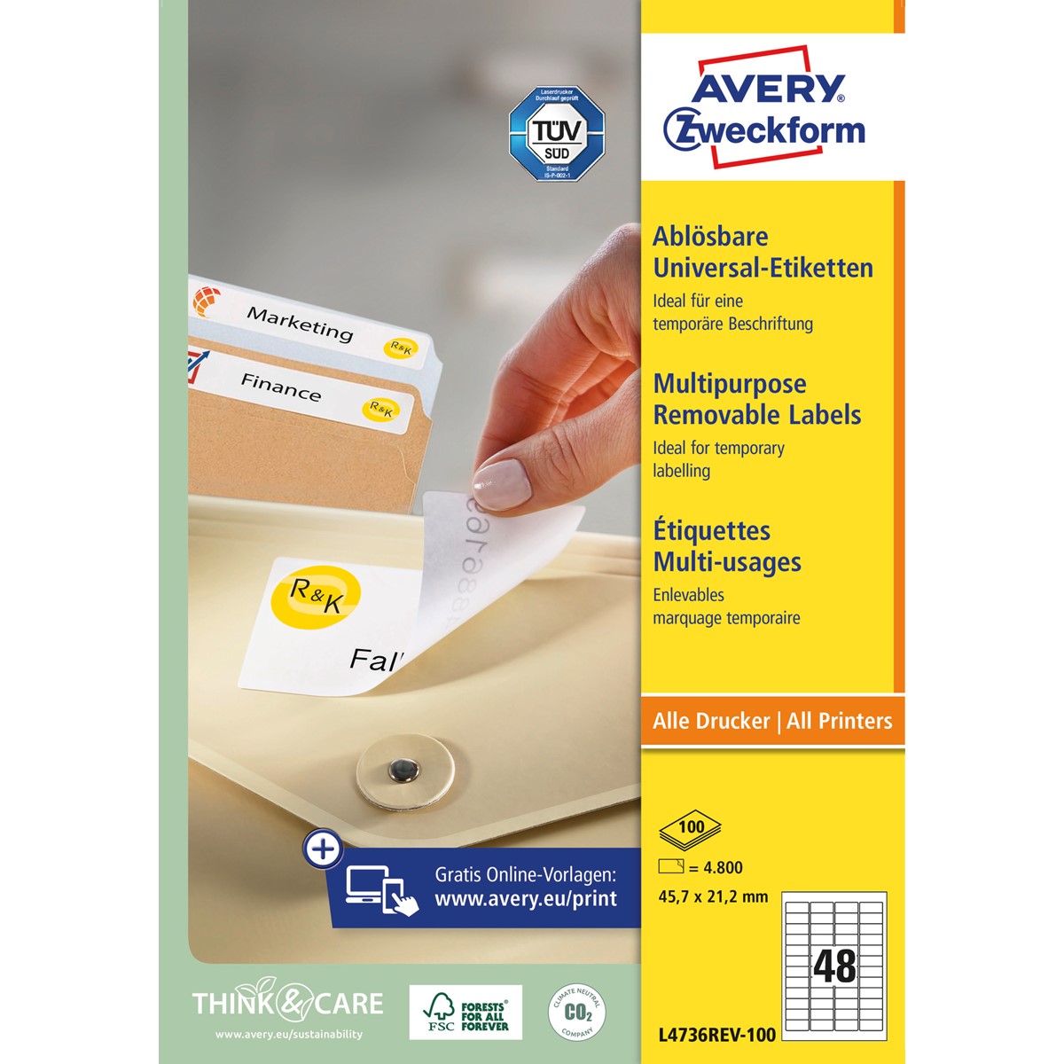 Qualität vom Etiketten-Experten: die weißen ablösbaren Etiketten L4736REV-100 im Format 45,7 x 21,2 mm von Avery Zweckform haften sicher auf den verschiedensten Oberflächen und können entfernt werden, ohne Klebstoffrückstände zu hinterlassen. Sie eignen sich sehr gut z.B. zur Beschriftung von Gewürzen (4.800Etiketten/Pack).