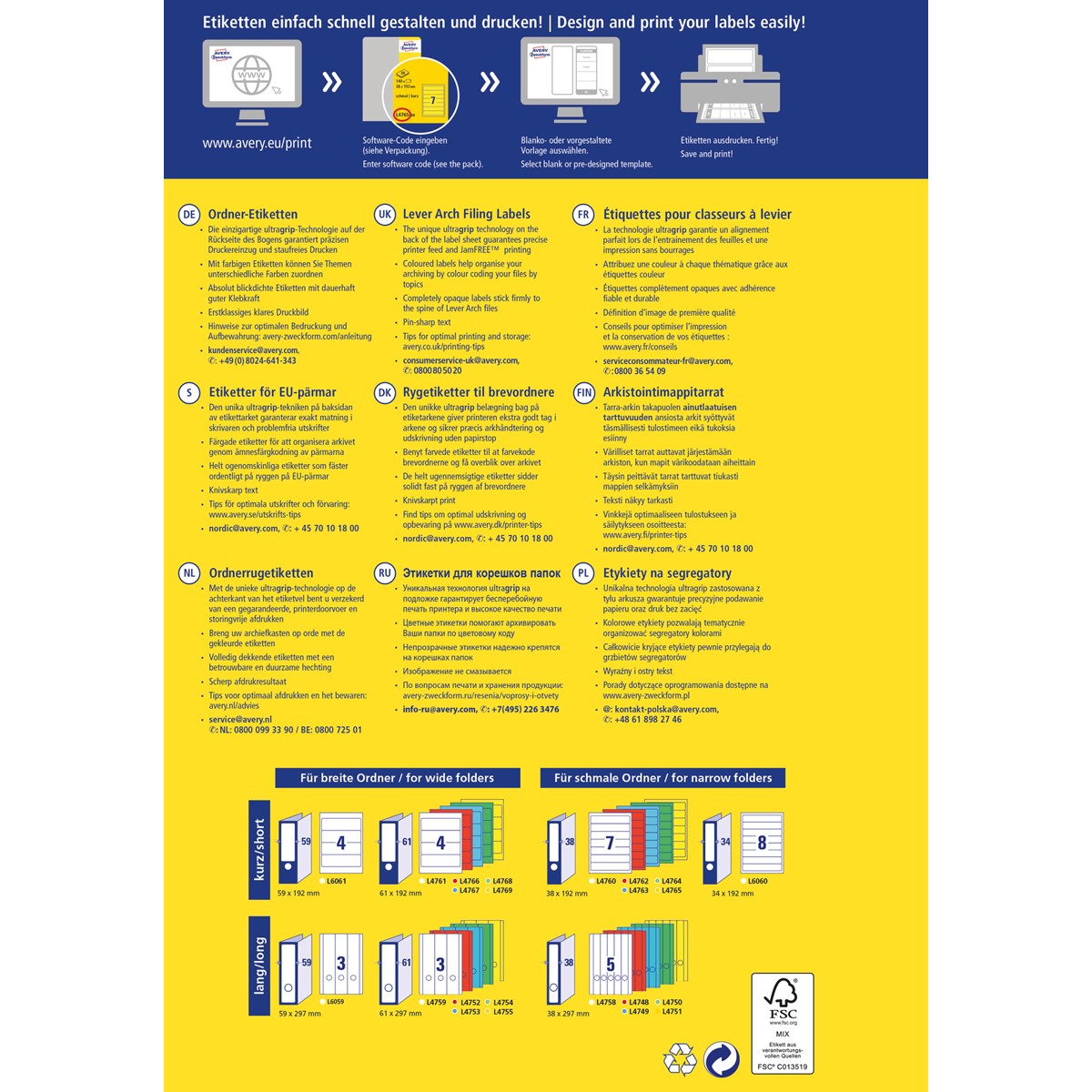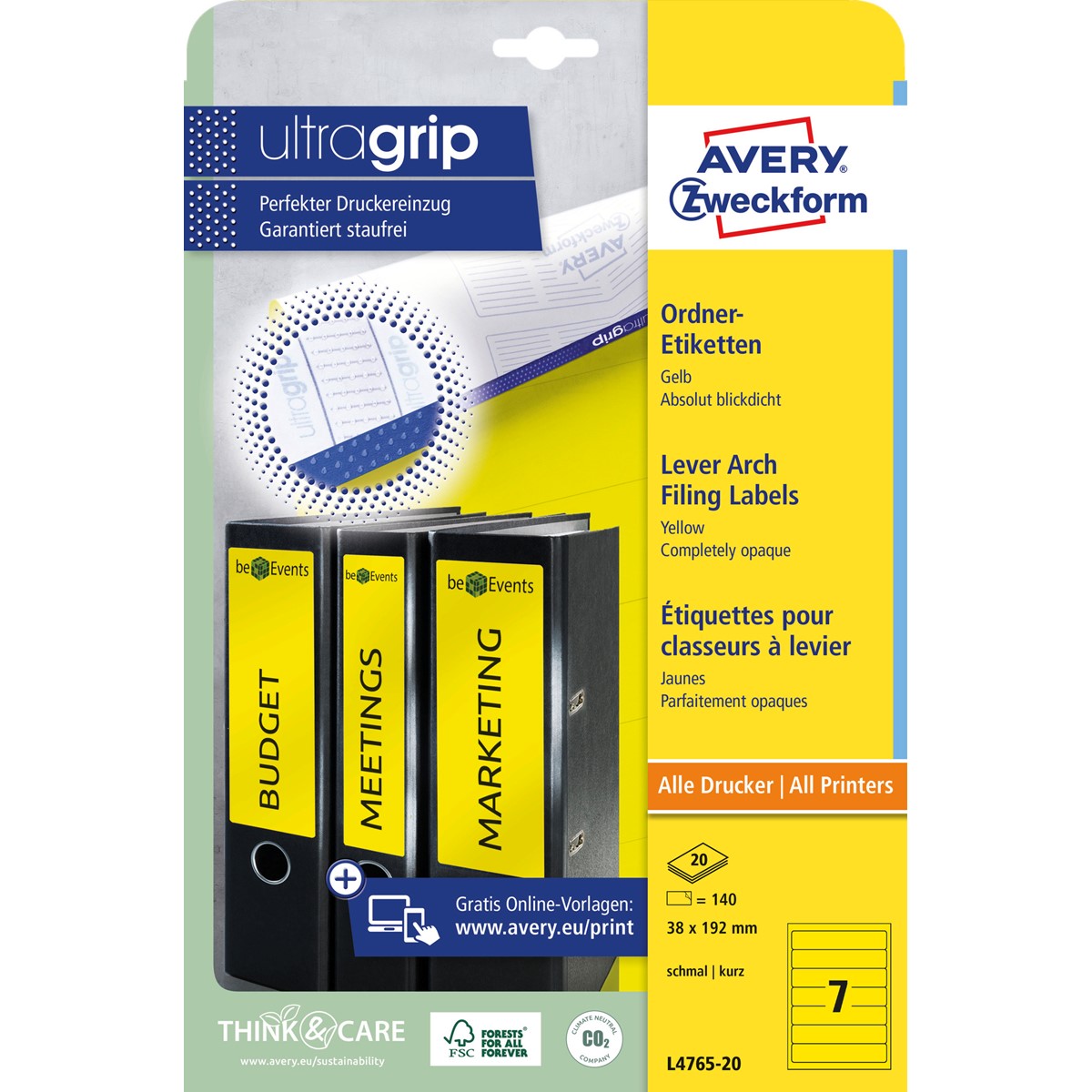 Qualität vom Etiketten-Experten: die gelben, selbstklebenden Ordner-Etiketten L4765-20 im Format 38 x 192 mm (schmal/kurz) von Avery Zweckform sind absolut blickdicht und kleben dauerhaft sicher auf allen gängigen schmalen Standard-Ordnern wie z.B. Leitz, Elba, Esselte, Mehle, Herlitz und Bene. 140 Ordner-Etiketten auf 20 Bogen.