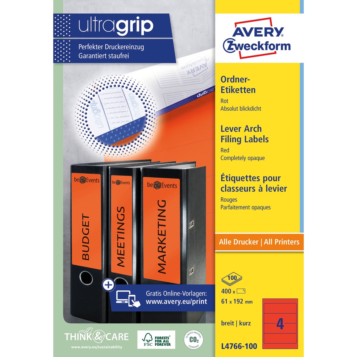 Qualität vom Etiketten-Experten: die roten, selbstklebenden Ordner-Etiketten L4766-100 im Format 61 x 192 mm (breit/kurz) von Avery Zweckform sind absolut blickdicht und kleben dauerhaft sicher auf allen gängigen breiten Standard-Ordnern wie z.B. Leitz, Elba, Falken, Mehle, Bene und Biella. 400 Ordner-Etiketten auf 100 Bogen.