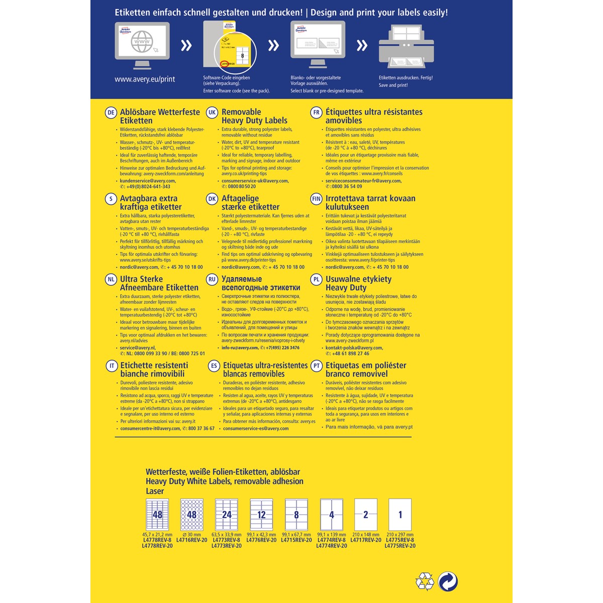 Qualität vom Etiketten-Experten: die ablösbaren, wetterfesten Etiketten L4775REV-8 im Format 210 x 297 mm für Laser-Drucker von Avery Zweckform zeichnen sich durch eine extreme Strapazierfähigkeit im Innen- und Außenbereich aus. 8 matt beschichtete Folien-Etiketten aus Polyester auf 8 Bogen.