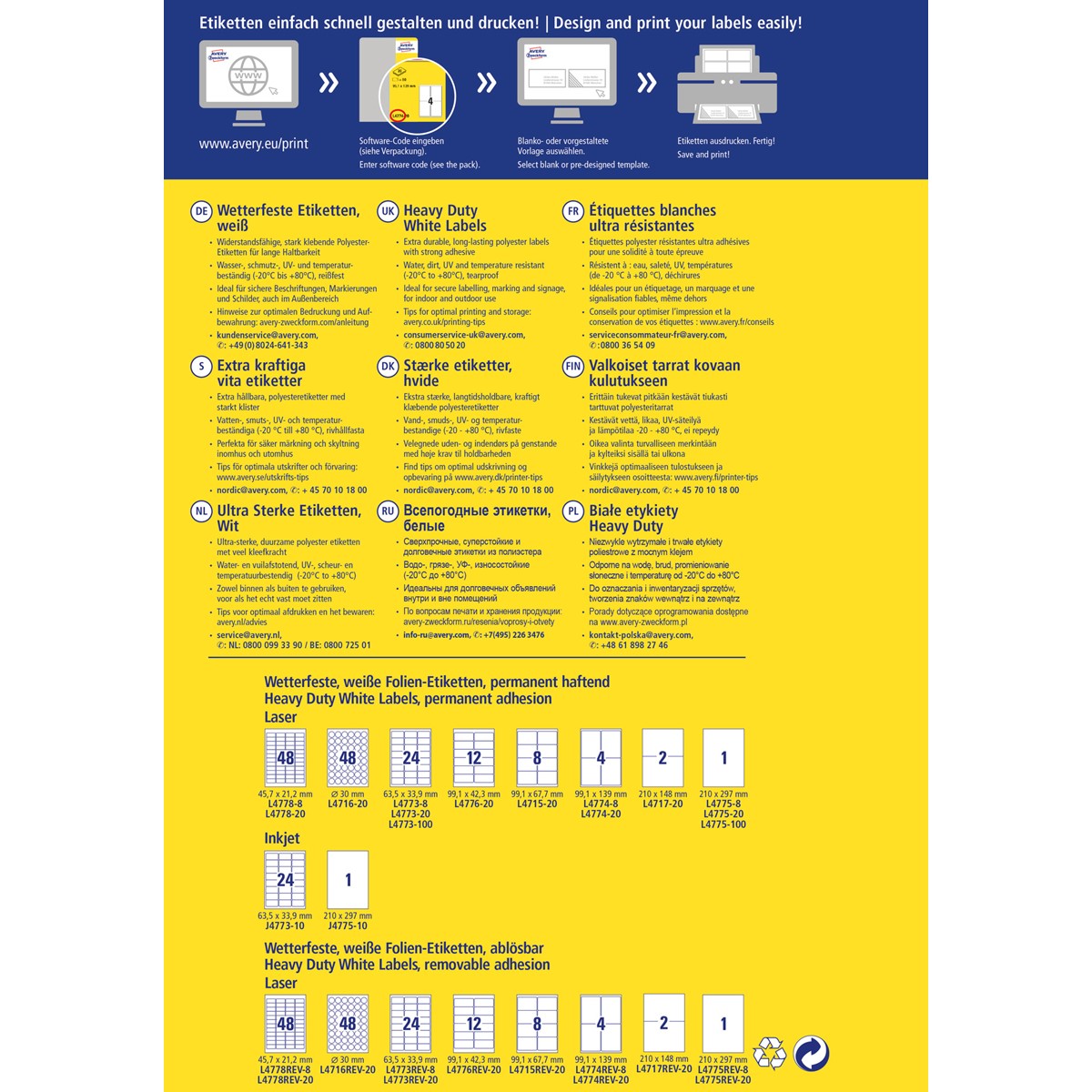 Qualität vom Etiketten-Experten: die weißen, wetterfesten Etiketten L4776-20 im Format 99,1 x 42,3 mm für Laser-Drucker von Avery Zweckform zeichnen sich durch eine extreme Strapazierfähigkeit im Innen- und Außenbereich aus. 240 matt beschichtete Folien-Etiketten aus Polyester auf 20 Bogen.