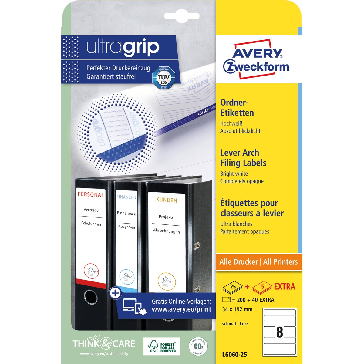 Qualität vom Etiketten-Experten: die weißen, selbstklebenden Ordner-Etiketten L6060-25 im Format 34 x 192 mm (schmal/kurz) von Avery Zweckform kleben dauerhaft sicher auf den schmalen Ordnern von Elba, Falken, Biella und Mehle. 200 Etiketten + 40 EXTRA pro Packung. Die Etiketten sind besonders blickdicht und decken so alte Beschriftungen und Etiketten zuverlässig und sauber ab.