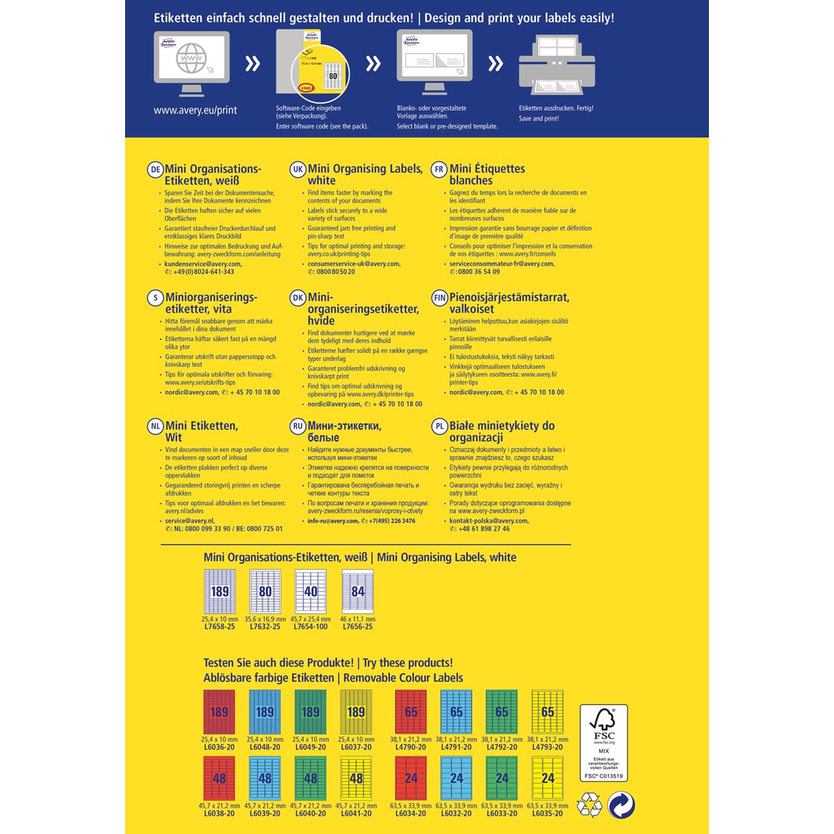 Die weißen Mini Organisations-Etiketten L7632-25 im Format 35,6x16,9mm von AVERY ZWECKFORM sind ideal zur Kennzeichnung und zum Organisieren Ihrer Dokumente. 2000 Etiketten auf 25 Bogen. Sie können sich auf einen absolut staufreien Druckerdurchlauf ohne Klebstoffablagerungen im Drucker verlassen. Umweltfreundlich, FSC® zertifiziert, chlorfrei gebleicht. Gestalten und drucken Sie Ihre Aufkleber schnell und einfach - mit den kostenlosen Avery Zweckform Etiketten Vorlagen und Software-Lösungen unter www.avery-zweckform.eu/print oder den im Microsoft® Office Paket integrierten Basis-Vorlagen. Geeignet für alle gängigen Laser- und Inkjetdrucker, Kopierer, Farblaserdrucker und Farbkopierer.