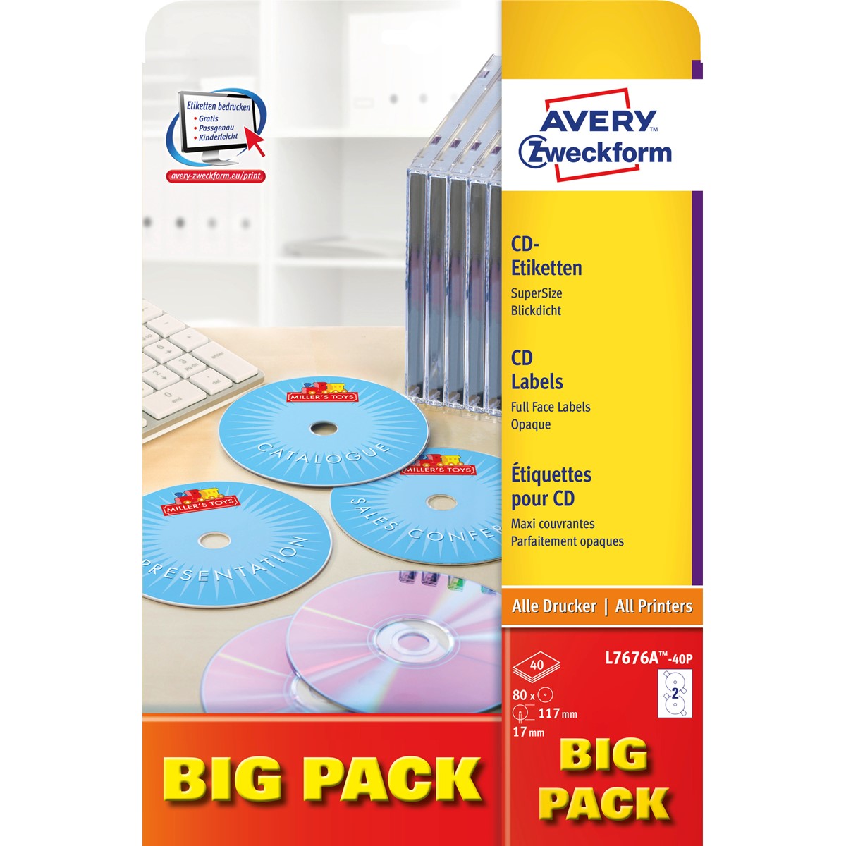 Beeindrucken Sie Ihre Kunden mit professionell gestalteten CDs. Mit den SuperSize CD-Etiketten von Avery Zweckform gelingt das mühelos. Die matten CD-Aufkleber sind mit praktischen Haltelaschen ausgestattet, die ein einfaches und mittiges Aufbringen ermöglichen. Dank der kostenlosen Avery Zweckform Vorlagen und Software-Lösungen können Sie die SuperSize CD-Etiketten schnell und einfach gestalten und mit Inkjetdrucker bedrucken!