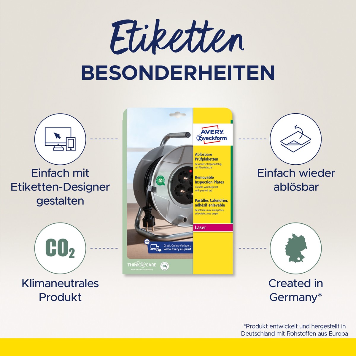 Qualität vom Etiketten-Experten: die wetterfesten und ablösbaren Prüfplaketten L7804-10 im runden, Ø 30 mm Format von Avery Zweckform sind besonders strapazierfähig. 240 Prüfplaketten auf 10 Bogen.
