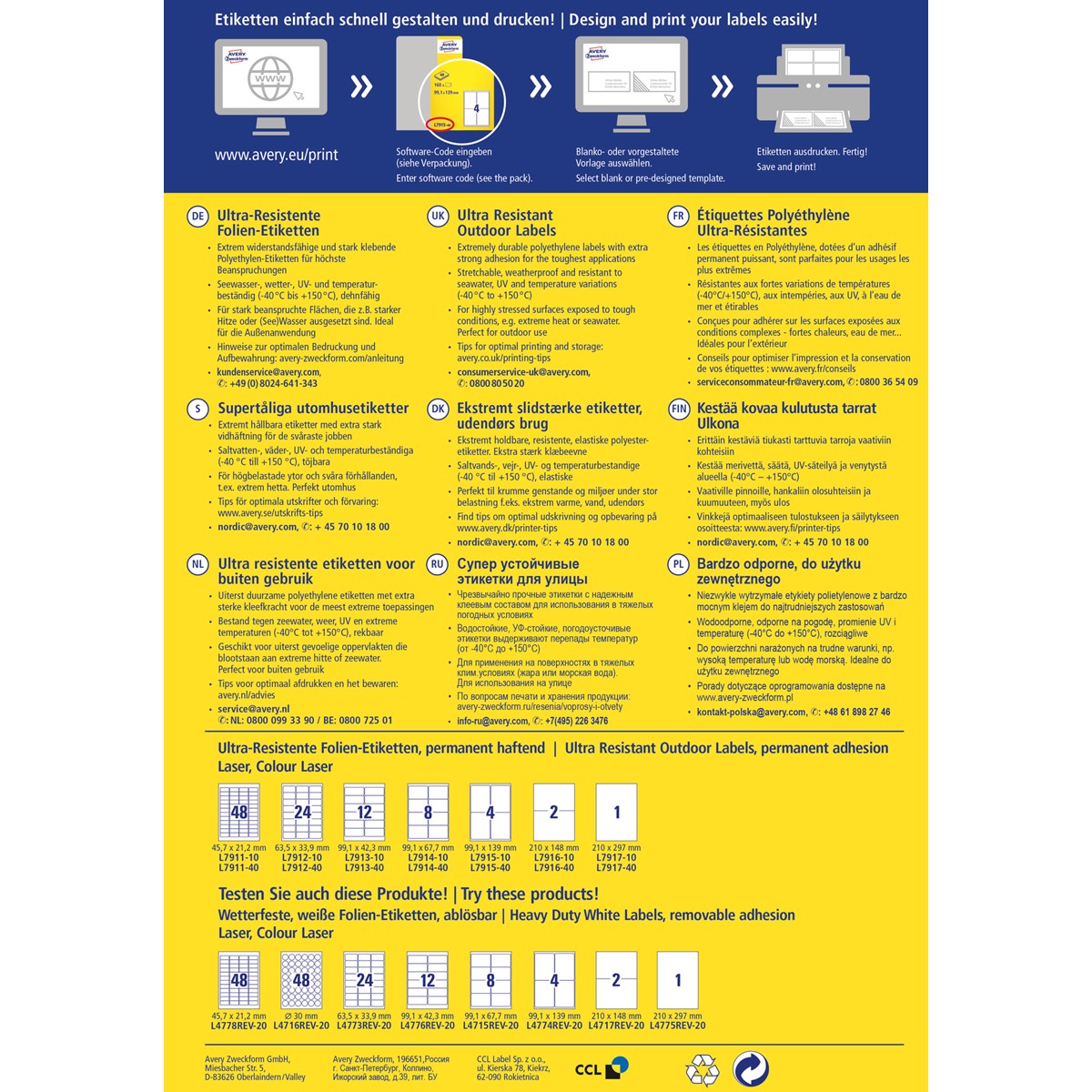 Qualität vom Etiketten-Experten: die weißen, ultra-resistenten Folien-Etiketten L7912-40 im Format 63,5 x 33,9 mm von Avery Zweckform zeichnen sich durch eine hohe Strapazierfähigkeit für höchste Beanspruchungen im Innen- und Außenraum aus. 960 matt beschichtete Folien-Etiketten aus dehnfähigem Polyethylen auf 40 Bogen.