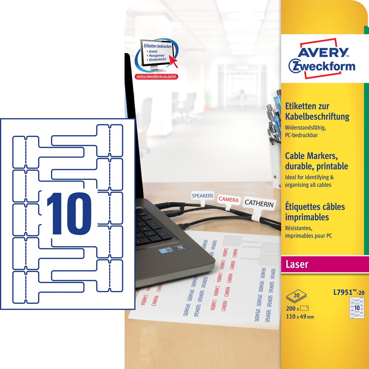 Bringen Sie Ordnung in den Kabelsalat! Die Kabel-Etiketten von Avery Zweckform sind ideal zur Beschriftung und Organisation von Kabeln am Computer, Telefon und anderen Geräten im Büro und zu Hause. Die Kabel-Etiketten im Format 110 x 49 mm sind besonders widerstandsfähig. Sie halten selbst härtesten Bedingungen stand und sind auch im Freien verwendbar.