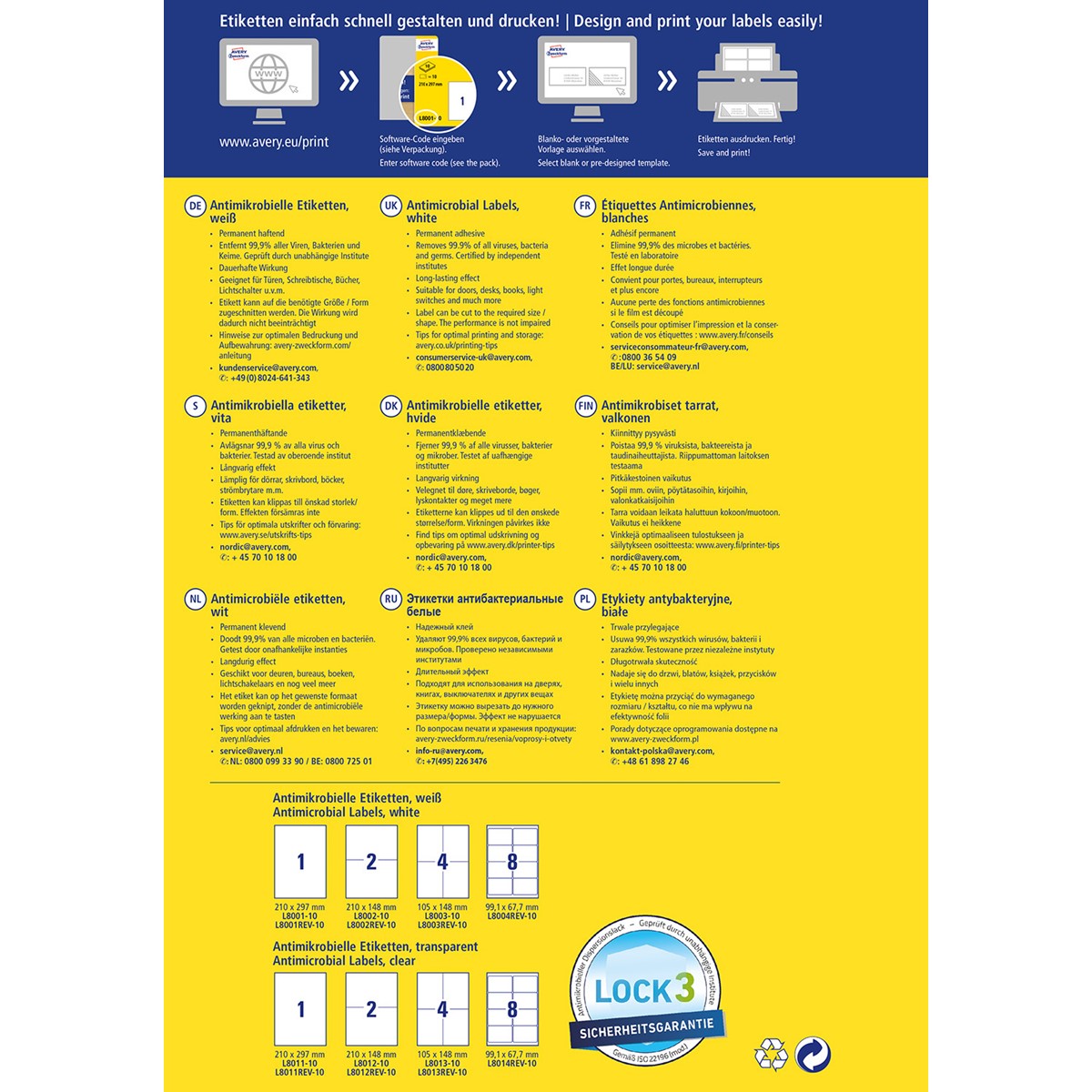 Die weißen, antimikrobiellen Folienetiketten L8003-10 im Format 105x148mm von AVERY ZWECKFORM entfernen 99,9% aller Viren, Bakterien und Keime und sind besonders wetterfest und widerstandsfähig. 40 antimikrobielle, permanent haftende Folienetiketten auf 10 Bogen.