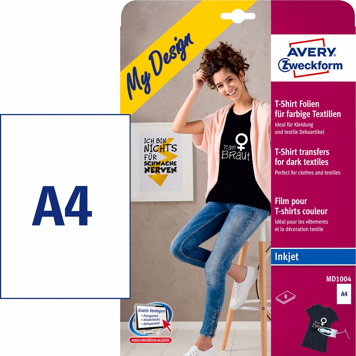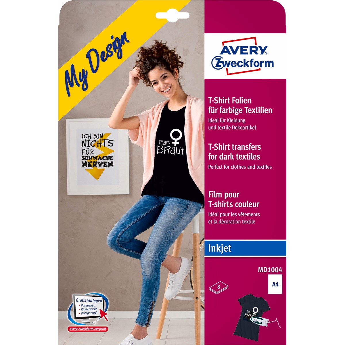 Die Textilfolie für farbige Textilien MD1004 von AVERY ZWECKFORM im A4 Format ist perfekt für originelle Geschenke oder Dekorationen. Mit dieser Transferfolie können Sie z.B. für den nächsten Kindergeburtstag T-Shirts bedrucken. Gewünschtes Motiv einfach am PC gestalten und mit einem Inkjet-Drucker bedrucken. Sie können damit nicht nur T-Shirts, sondern auch Kopfkissen, Schürzen, Tischdecken usw. bedrucken. Die Avery Zweckform Transferfolie eignet sich für alle farbigen Baumwolltextilien, so kommt das jeweilige Motiv besonders gut zur Geltung und überzeugt durch optimale Farbkraft. Die 8 Folien sind nach dem Aufbügeln waschmaschinenfest bei 30°C.