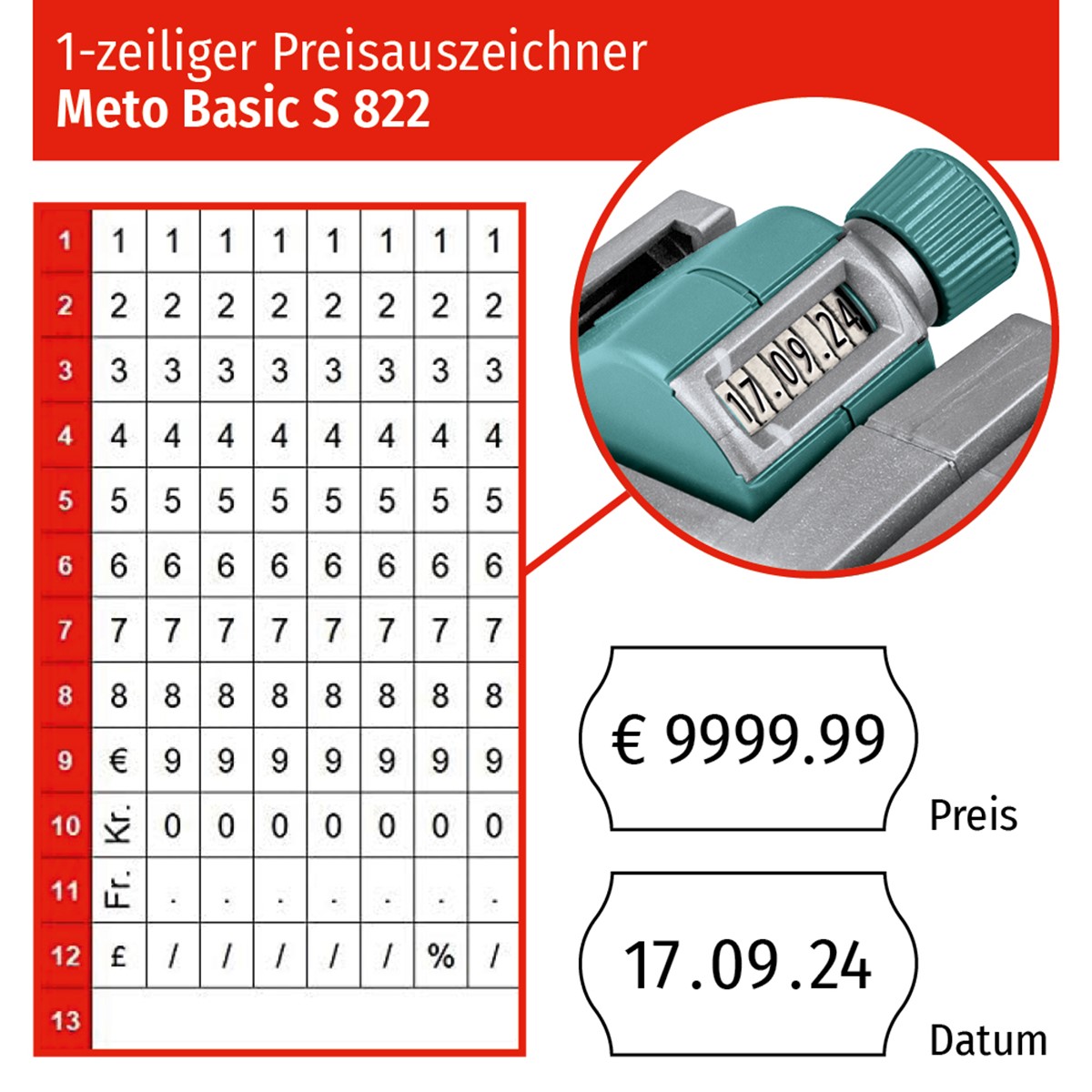 Verkaufsfördernde Produktkennzeichnung: Der 1-zeilige Preisauszeichner Meto Basic S ist vielseitig einsetzbar: Ob Gastronomie, selbstständige Ladenbesitzer, Handel, Industrie, Apotheke/Medizin, Logistik oder Textil – mit unserem Preisauszeichner kennzeichnen Sie überall dort, wo punktgenaue Informationen notwendig sind. Das Design der Meto Basic S ist von den Bedürfnissen seiner Anwender:innen inspiriert. Ein ergonomischer Griff garantiert ein ermüdungsfreies Arbeiten. Zudem schont die innovative Gewichtsverteilung des Druckwerkes das Handgelenk. Hochwertige Materialien und regelmäßige Qualitätskontrollen machen aus dem Preisauszeichner ein robustes und langlebiges Gerät inklusive einem Jahr Garantie. Vertrauen Sie dem Original. Vertrauen Sie Ihrer Meto. In der Kennzeichnung ist eine präzise und konstante Druckqualität essenziell. Good-bye unleserliche Etiketten – die ausgereiften Einzelbänder der Meto Basic S sorgen immer für das optimale Druckergebnis. Made in Germany. Auch nerviges Gefriemel gehört der Vergangenheit an: Unser Easy-handle-System ermöglicht einen einfachen und sauberen Farbrollen- und Etikettenrollenwechsel. Dadurch kann jeder in kürzester Zeit den Preisauszeichner ettiketierbereit justieren. Die Marke Meto steht weltweit für führende Aus- und Kennzeichnungs- sowie Verkaufsförderungslösungen für den Handel und dessen Lieferkette. Viele der von Meto entwickelten Auszeichnungs- und Absatzförderungslösungen gehören heute zum Standard im Handel.