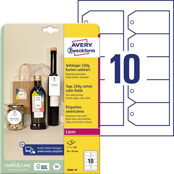 Qualität vom Etiketten-Experten: Die weißen, beidseitig bedruckbaren Anhänger T2002-10 im rechteckigem Format 90 x 50 mm mit abgeschrägten Ecken von AVERY ZWECKFORM sind sehr vielseitig verwendbar: z.B. als Produktanhänger zur Produktbeschriftung für Kleingewerbetreibende und Selbstvermarkter, als Hänge-Etikett zur Preis- & Warenauszeichnung oder als Geschenkanhänger zur Geschenkverpackung im Einzelhandel, als Textil-Anhänger zur Auszeichnung von Bekleidung im Modebereich und zur privaten Anwendung. 100 ultraweiße, satinierte Anhänger aus Karton auf 10 Bogen mit Faden.