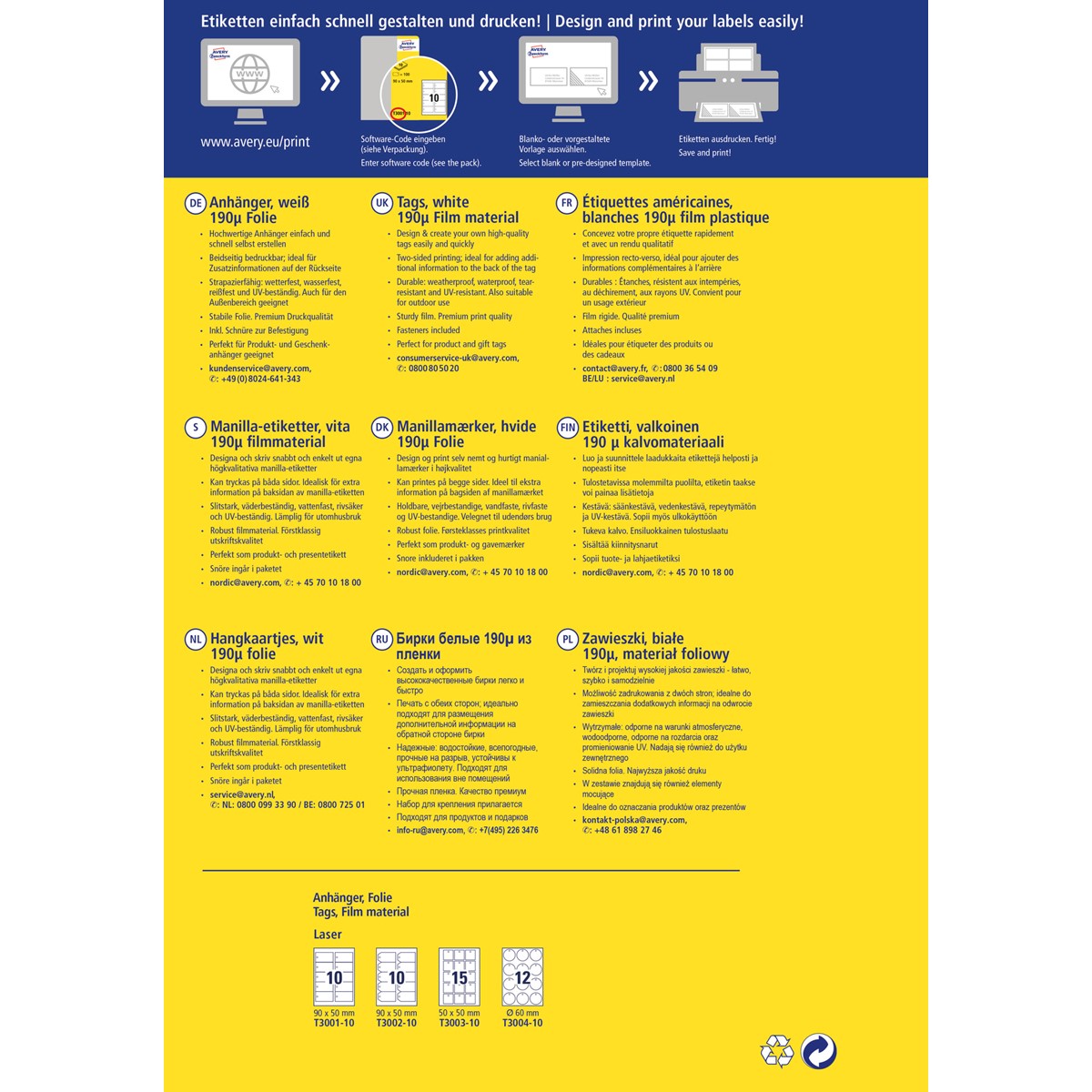 Die besonders hochwertigen Hänge-Etiketten aus strapazierfähiger, weißer Folie sind wasserfest, reißfest, chemikalienbeständig und UV-beständig. Ideal auch für den Außenbereich geeignet, durch die stabile Folienqualität wird versehentliches Einreißen des Hänge-Etiketts verhindert. Die Folien-Anhänger sind beidseitig bedruckbar - ideal für zusätzliche Informationen auf der Rückseite. Die Handhabung ist praktisch und effizient: nach dem Druck der DIN A4 Bogen können die einzelnen Anhänger sauber aus dem Bogen herausgetrennt werden. Die Anhänger können auf allen gängigen Laser-Druckern staufrei und präzise bedruckt werden, das griffige Folien-Material sorgt für eine Premium Druckqualität. Im Lieferumfang sind zusätzlich Schnüre zur Befestigung enthalten.