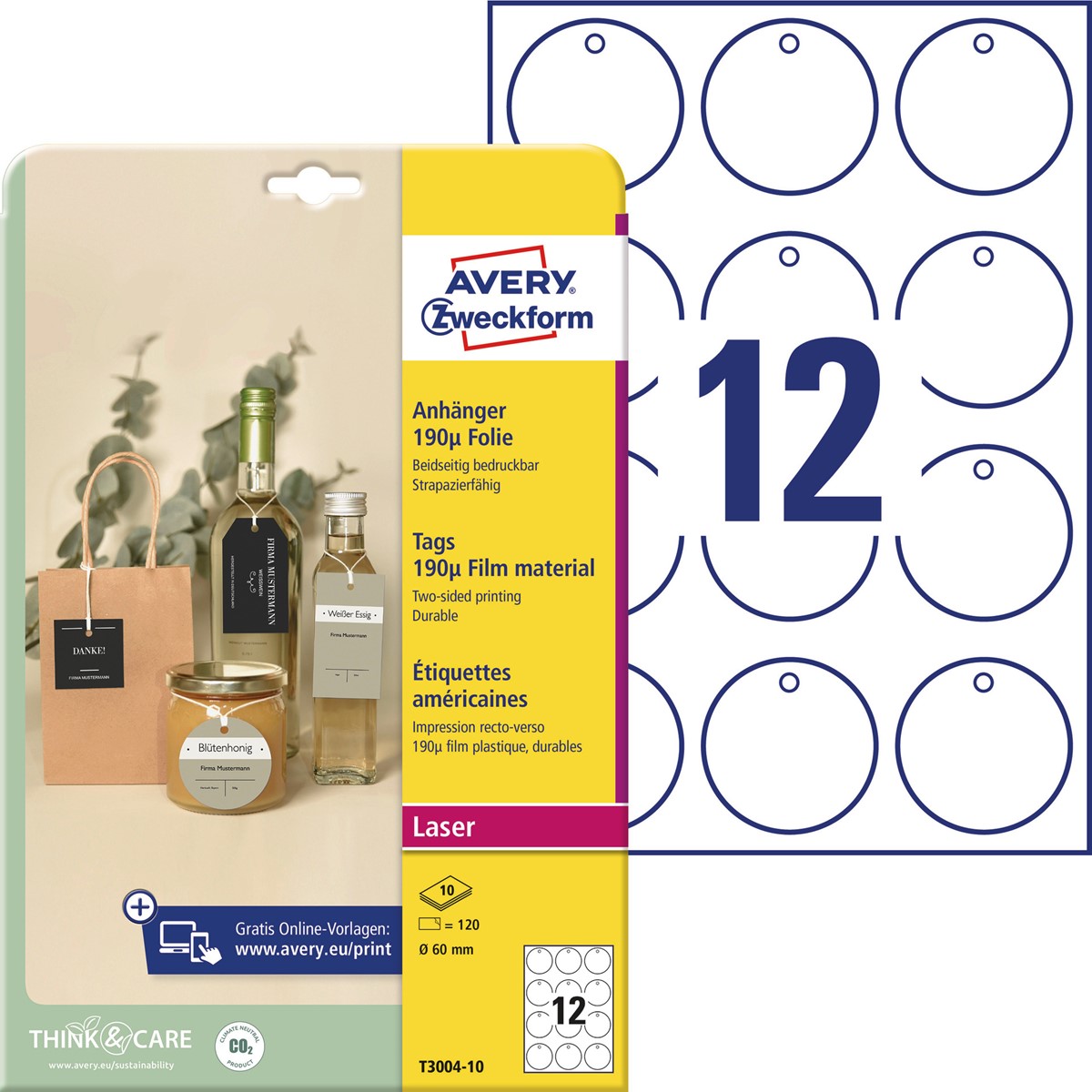 Qualität vom Etiketten-Experten: Die weißen, beidseitig bedruckbaren Folien-Anhänger T3004-10 im runden Format mit einem Durchmesser von 60 mm von AVERY ZWECKFORM sind sehr vielseitig verwendbar: z.B. als Produktanhänger zur Produktbeschriftung für Kleingewerbetreibende und Selbstvermarkter, als robustes Hänge-Etikett zur wasserfesten Warenauszeichnung im Einzel- und Großhandel, als Hänge-Etikett zur Auszeichnung von Pflanzen, Bäumen und ähnliches in Gärtnereien, Baumschulen, als Produktanhänger zur Auszeichnung in Baumärkten und im Industriebereich, zur Eigentumsauszeichnung in Werkstätten und KFZ-Betrieben, als Kolli-Anhänger zur Qualitätssicherung oder Materialflusskennzeichnung und natürlich auch zur privaten Anwendung. 120 weiße Folien-Anhänger auf 10 Bogen.