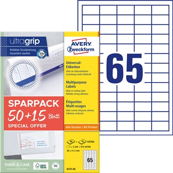 Qualität vom Etiketten-Experten: Mit 15 Blatt EXTRA-Inhalt! Die weißen Universal-Etiketten 6121-65 im Sparpack im Format 38 x 21,2 mm von Avery Zweckform haften mit starker permanenter Klebkraft absolut zuverlässig auf Papier, Karton, Glas und vielen gängigen Kunststoffen. Sie sind die Premium-Lösung zur Beschriftung von Unterlagen, Dokumenten und vielem mehr in Office und Home Office oder auch privat. Zur Nummerierung von Gegenständen ist das Format besonders geeignet (3.250 Etiketten/Pack + 975 Etiketten EXTRA).