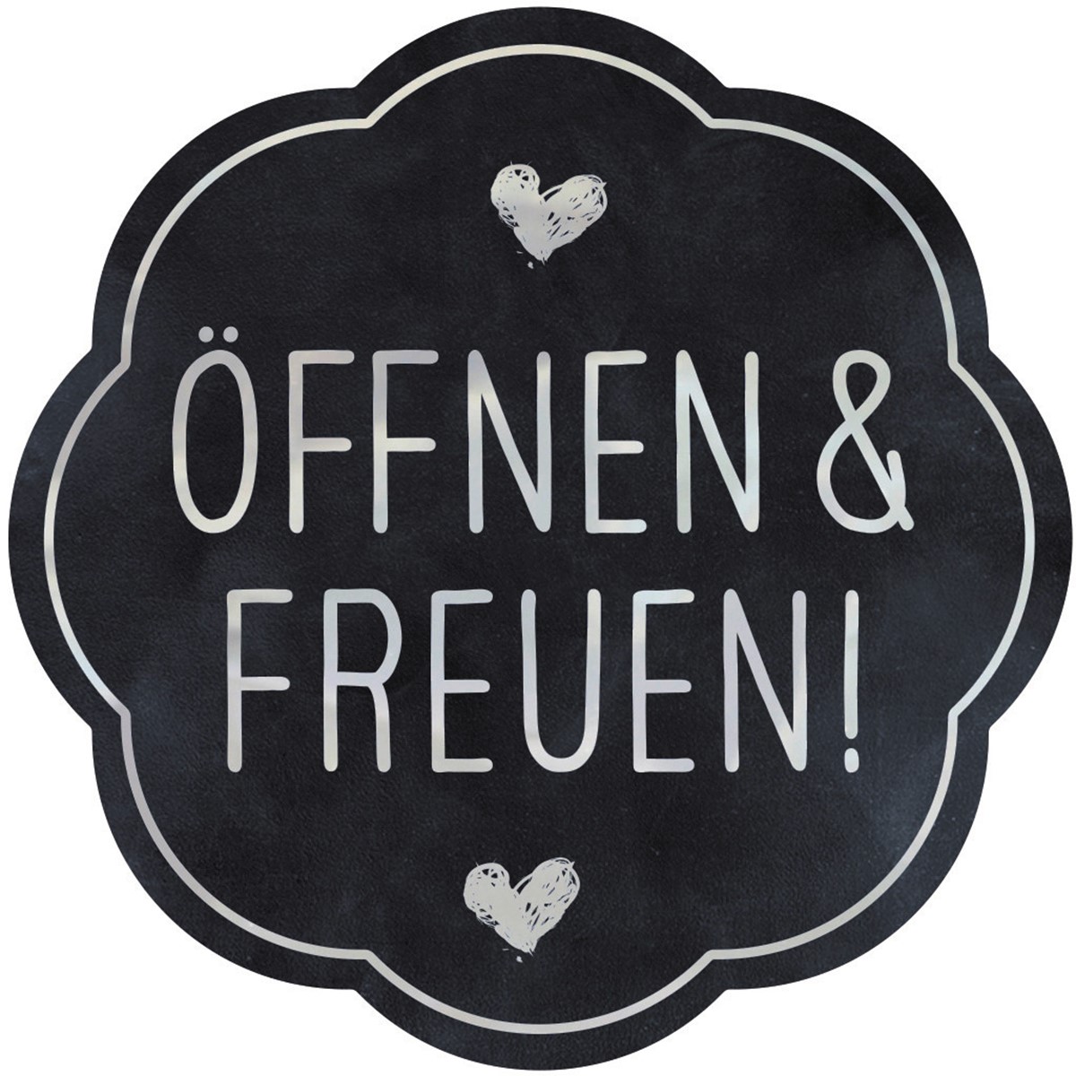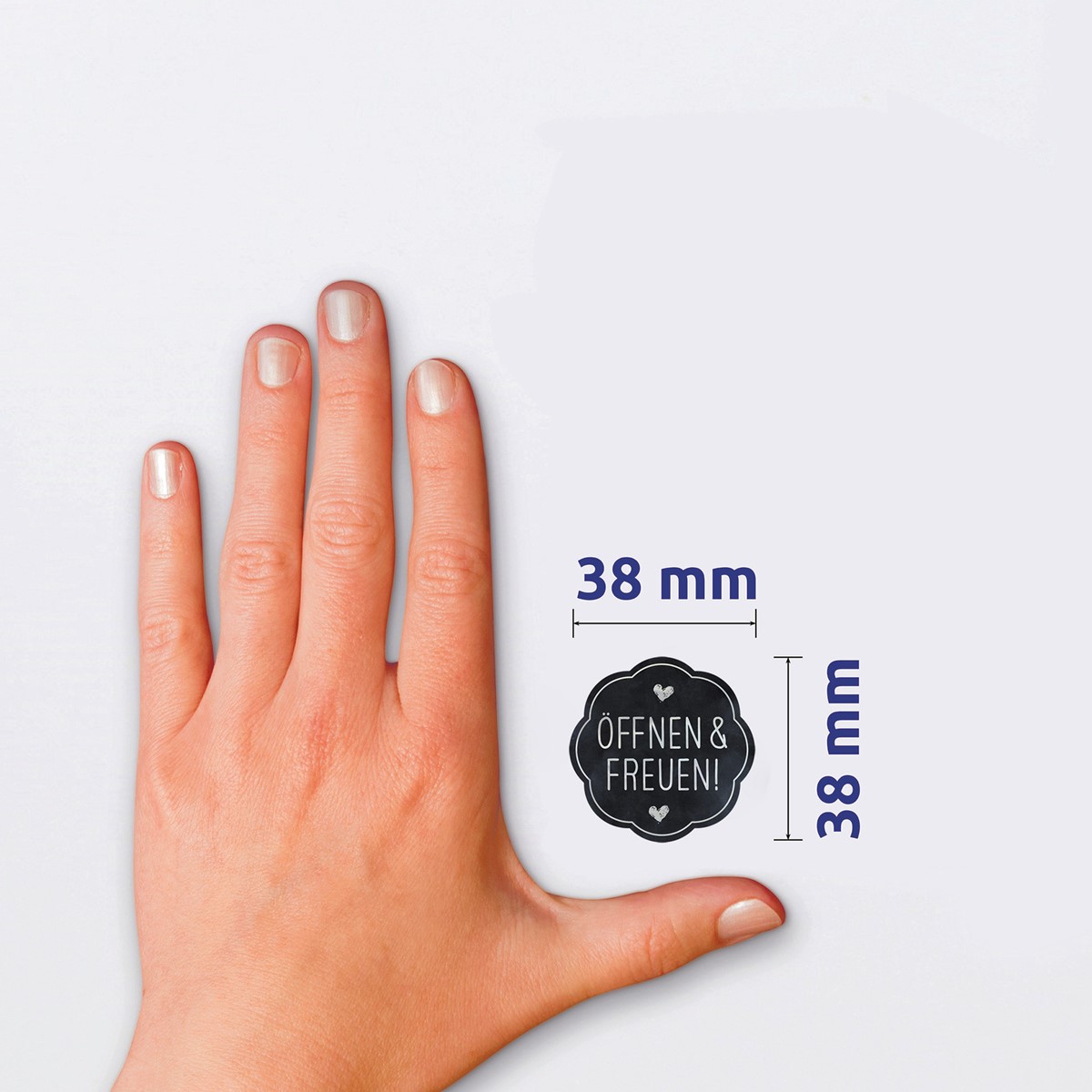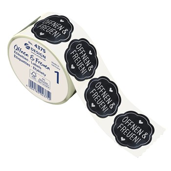 Vorfreude ist die schönste Freude! Mit diesen edel gestalteten Stickern im grauen Tafel-Look mit silber glänzender Schrift „Öffnen & Freuen“ von Z-Design können Sie Kunden begeistern. Effiziente Großpackung: Die 600 hochwertig bedruckten Promotion-Etiketten 4375 werden auf einer eingeschweißten Rolle geliefert. Die zuverlässig haftenden Werbesticker sind ideal für den gewerblichen Gebrauch, aber auch ideal für die private Verwendung. Das Blumen-Format mit einem Durchmesser von 38 mm ist dabei perfekt abgestimmt für eine gute Sichtbarkeit auf Tüten, Kartons, Paketen, Geschenken und Umschlägen oder als Siegeletikett.
