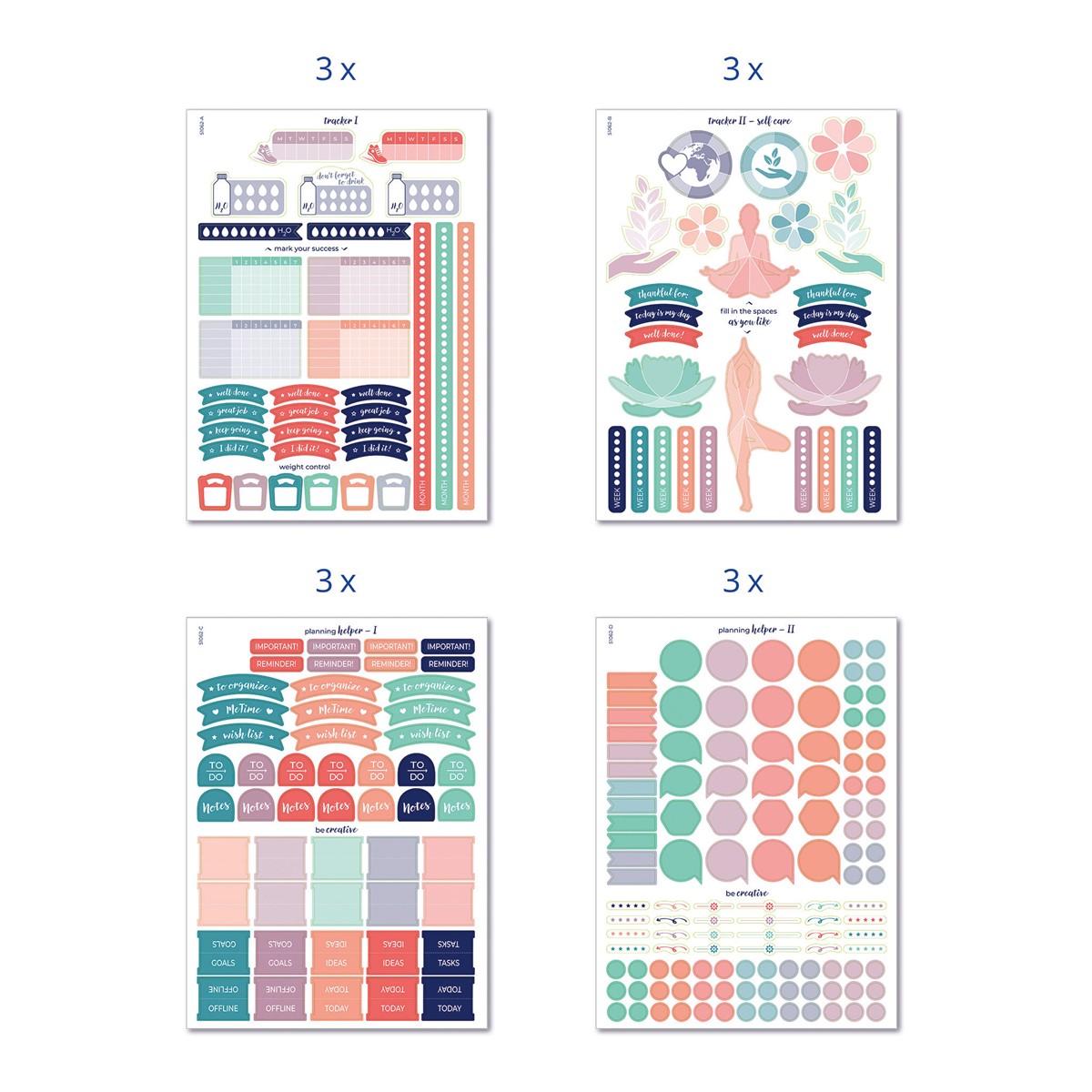Das Planner Sticker Set enthält 690 Planner Sticker in 3 verschiedenen Kategorien: Tracker Sticker, Aufkleber mit diversen Überschriften & Abteiler und Orga Sticker - für eine farbenfrohe Organisation.
