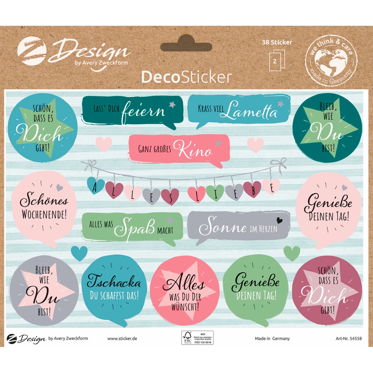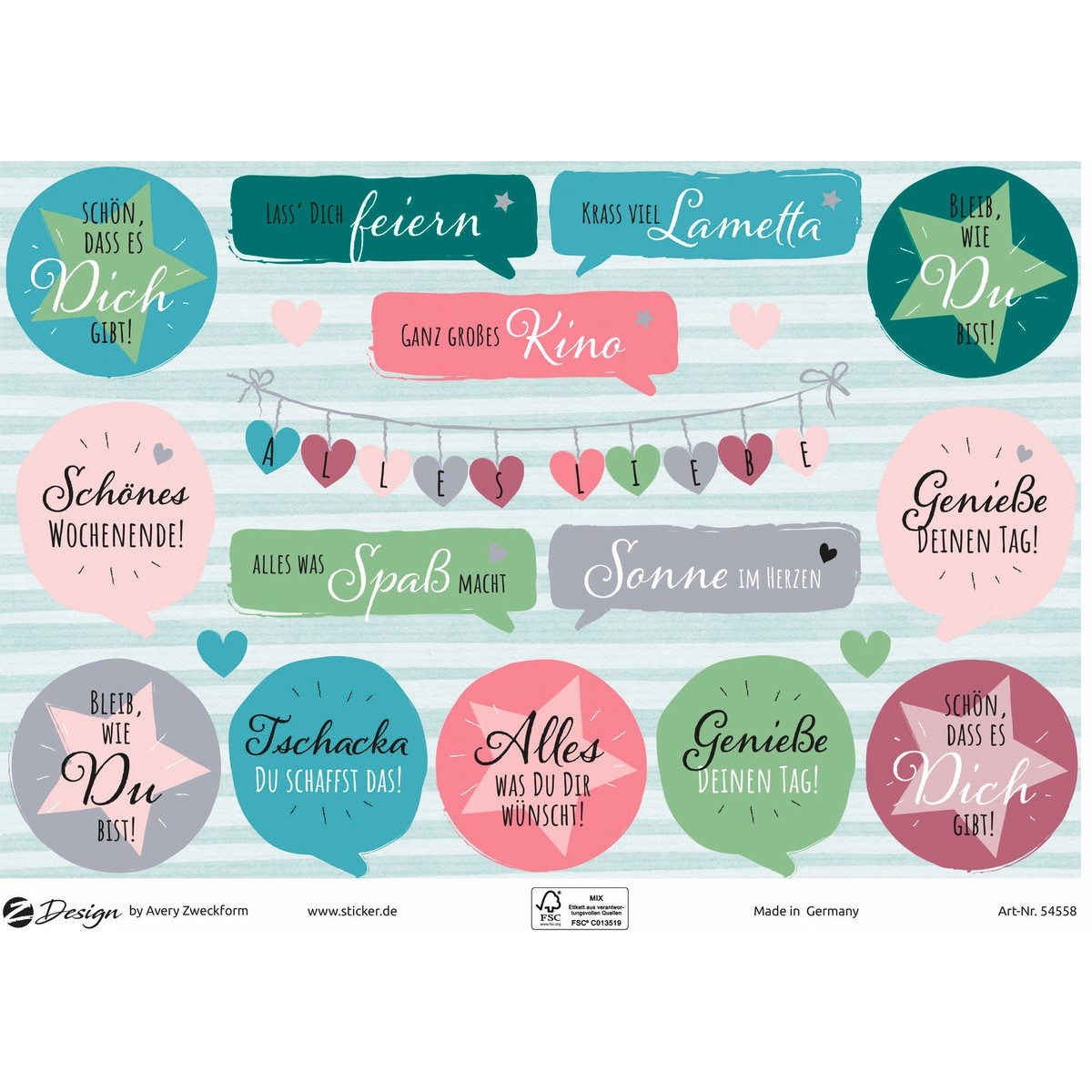 Sagen Sie es mit Liebe - mit tollen Stickern! Mit den Stickern von Z-Design zaubern Sie ein Lächeln auf Gesichter. Nicht nur Freunde und Verwandte werden sich über die Gute Wünsche-Sticker zum Verschönern freuen. Dekorieren Sie Karten, Briefe, Mitbringsel, das Fläschchen Wein oder Geschenke mit den liebevollen, hochwertigen Aufklebern mit Silberprägung. Die selbstklebenden, großformatigen A5 Schmucketiketten zum Gestalten und Dekorieren aus dem Hause AVERY ZWECKFORM sind natürlich aus geprüfter, nachhaltiger Top-Qualität, die kindersicheren Klebeetiketten werden regelmäßig extern kontrolliert und bestätigt.