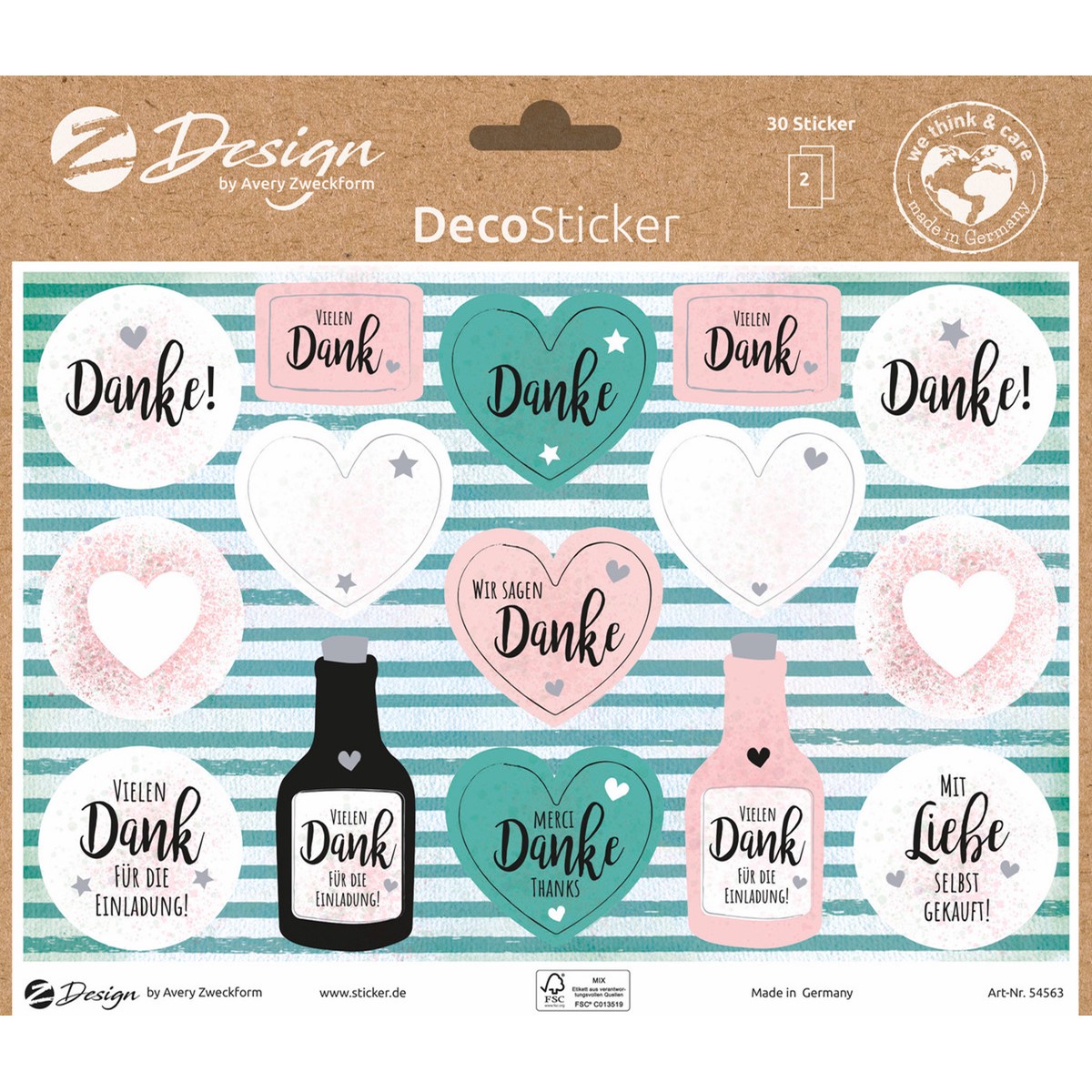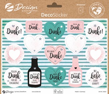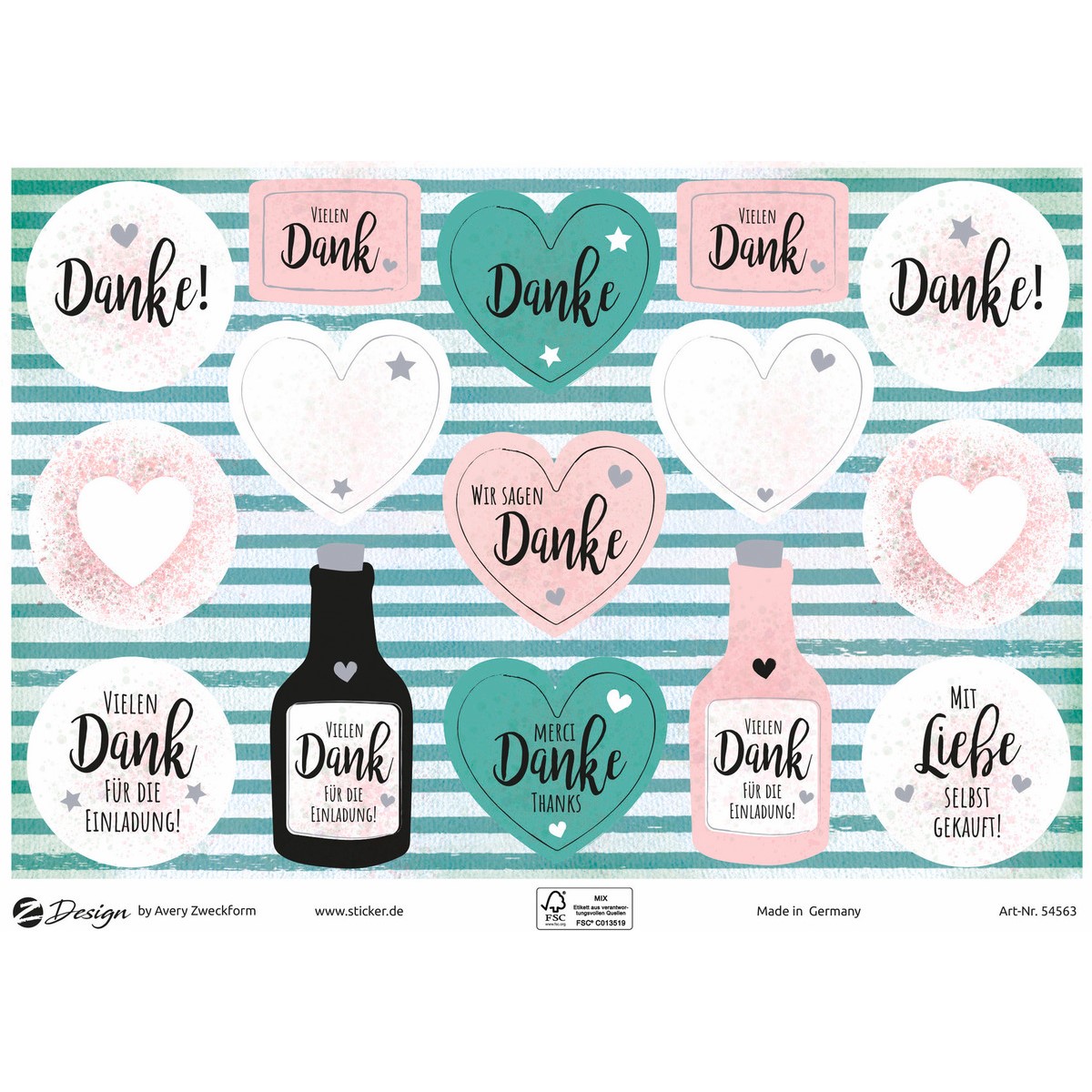 Sagen Sie es mit Liebe - mit tollen Stickern! Mit den Stickern von Z-Design zaubern Sie ein Lächeln auf Gesichter. Nicht nur Freunde und Verwandte werden sich über die Danke-Sticker zum Verschönern freuen. Dekorieren Sie Karten, Briefe, Mitbringsel, das Fläschchen Wein oder Geschenke mit den liebevollen, hochwertigen Aufklebern mit Silberprägung. Die selbstklebenden, großformatigen A5 Schmucketiketten zum Gestalten und Dekorieren aus dem Hause AVERY ZWECKFORM sind natürlich aus geprüfter, nachhaltiger Top-Qualität, die kindersicheren Klebeetiketten werden regelmäßig extern kontrolliert und bestätigt.