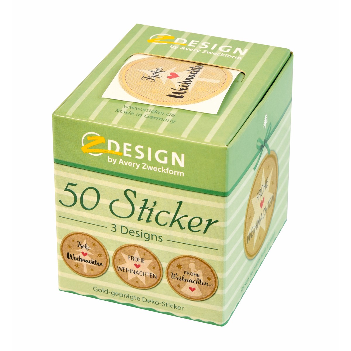 Die Weihnachtssticker auf Rolle 56827 im runden Format von AVERY ZWECKFORM sind ideal zum Dekorieren von Geschenken, Karten und Einladungen, speziell zur Weihnachtszeit. 50 Aufkleber "Frohe Weihnachten" auf Rolle im praktischen Kartonspender werden in einer stabilen Umverpackung für einen unversehrten Transport geliefert. Die 50 Weihnachtssticker auf Rolle wechseln das Design durch, insgesamt sind es 3 Design Varianten pro Rolle. Das Format mit einem Durchmesser von 38mm ist dabei perfekt abgestimmt auf Schleifen und Karten. Die Weihnachtssticker auf Rolle eignen sich also perfekt, um aus einem Geschenk oder einer Weihnachtskarte etwas Besonderes zu machen. Oder dekorieren Sie damit auch mal Christbaumkugeln oder Servietten am Weihnachtstisch. Zudem haften die Aufkleber zuverlässig. Avery Zweckform liefert bewährte Markenqualität vom Klassiker zum trendigen innovativen Produkt - darauf können Sie vertrauen.