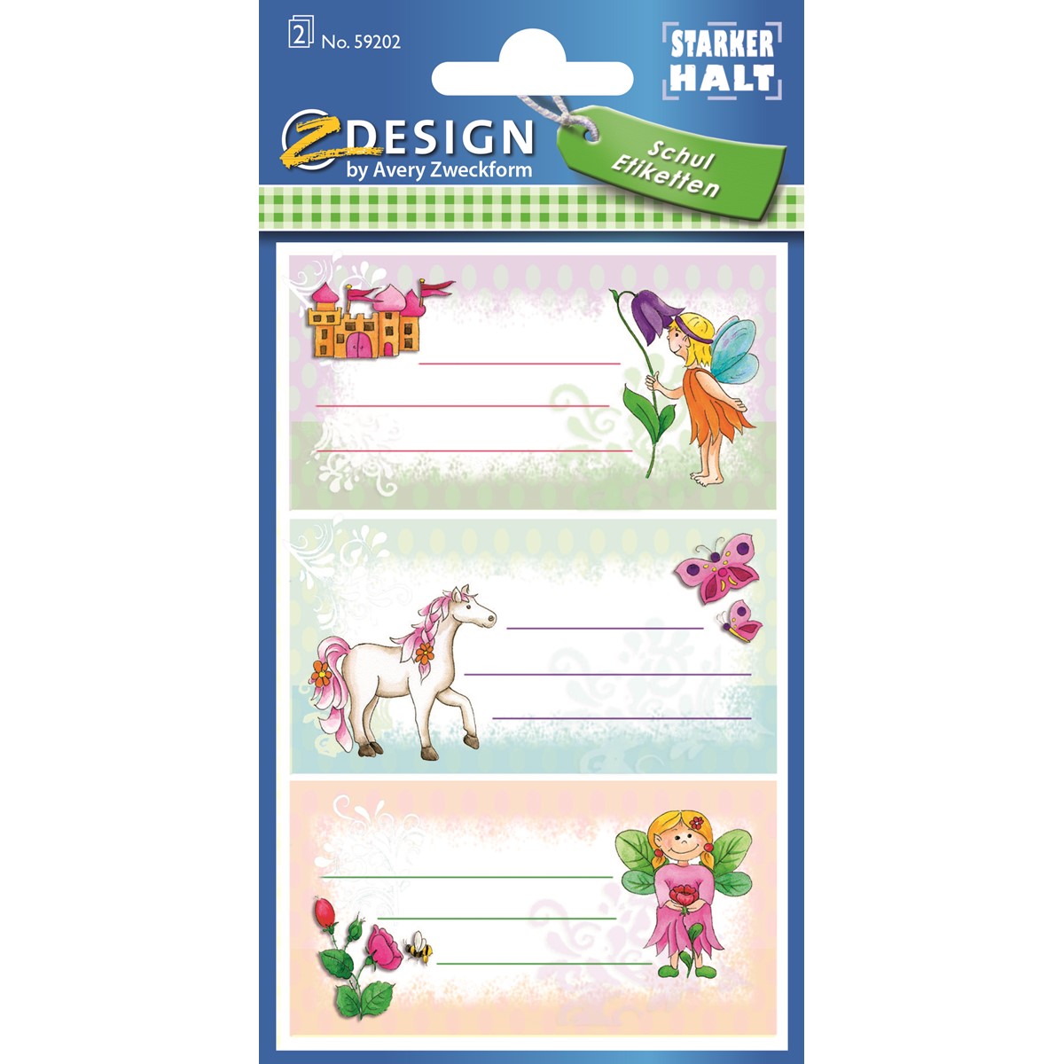 Die Schulzeit beginnt? Dann ist es Zeit, Ihre kleinen ABC Schützen gut vorzubereiten und zu organisieren - mit den lustigen und farbenfrohen Namensetiketten für die Schule von Z-Design. Die vorgestalteten Schuletiketten mit süßen Feen im Märchenland sind aus beschriftbarem Papier und eignen sich besonders gut zum Personalisieren von Heften und Büchern. So macht Schule Spaß!! Die selbstklebenden Namensschilder zum Gestalten und Dekorieren aus dem Hause AVERY ZWECKFORM sind natürlich aus geprüfter Top-Qualität, die kindersicheren Klebeetiketten werden regelmäßig extern kontrolliert und bestätigt.